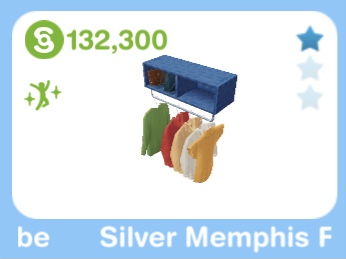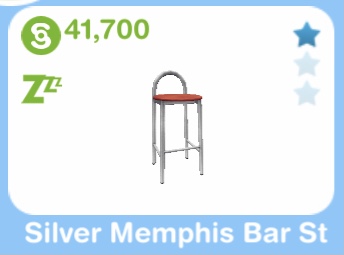 | Silver Memphis Bar Stool |  | S41,700 | Memphis Mansion | S4,170 | -Chairs & Stools -Simoleons -1 Star |