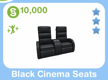 | Black Cinema Seat |  | S10,000 | Luxury Living | S1,000 | -Chairs & Stools -Simoleons -3 Stars |
