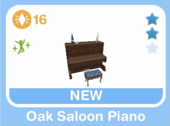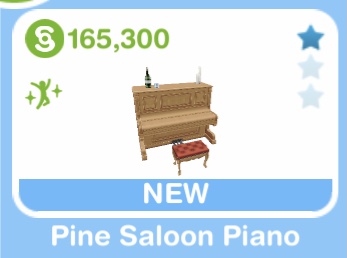 | Pine Saloon Piano |  | S165,300 | Stately Saloon | S16,530 | -Recreation -Simoleons -1 Star |