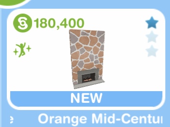 | Orange Mid-Century Fireplace |  | S180,400 | Mid-Century Mansion | S18,040 | -Miscellaneous -Simoleons -1 Star |