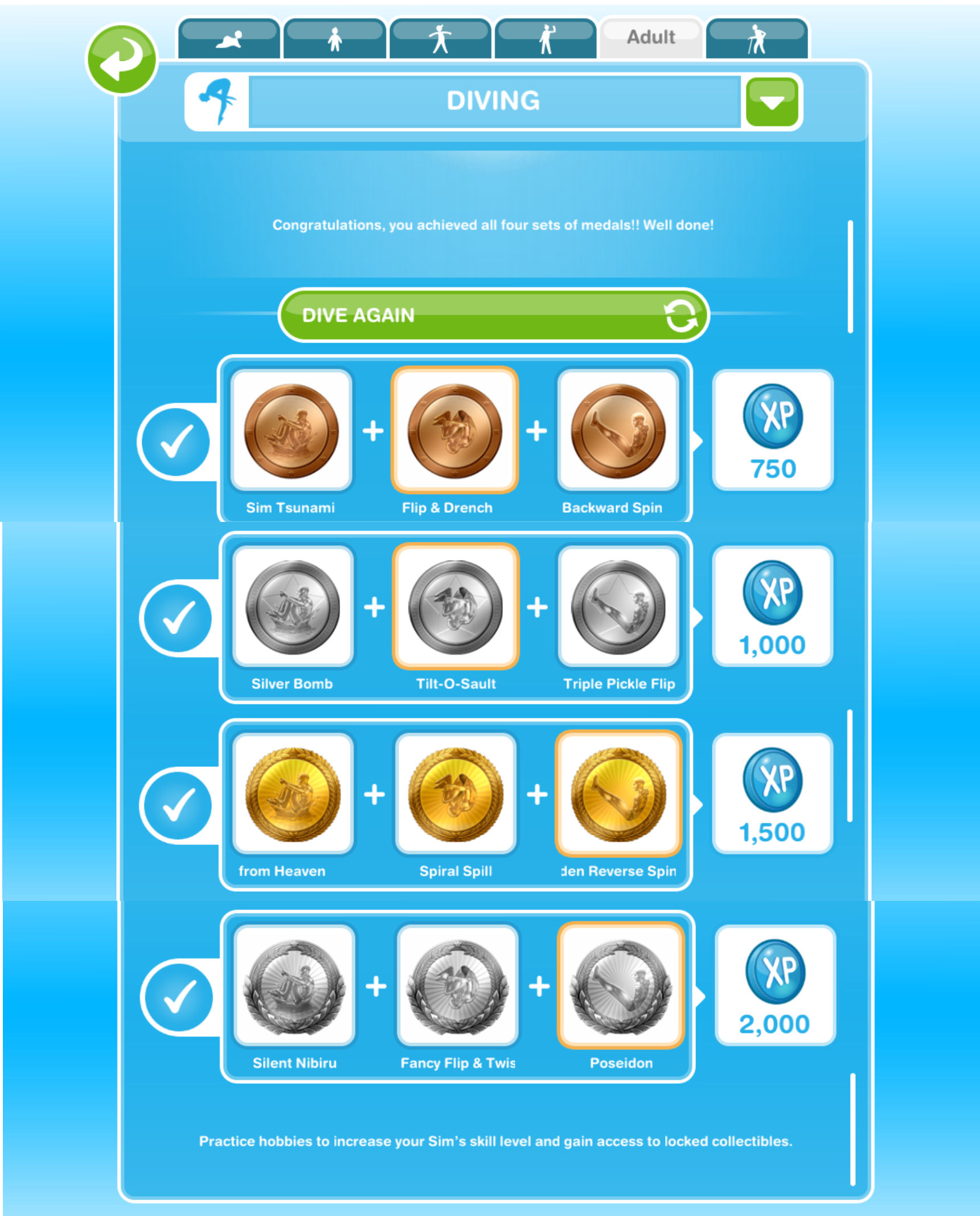 After the time has passed come back and click the exclamation mark above your sims head to find one of the diving medal collectibles. Every time you complete one of the options above your diving hobby skill level up percentage will increase, once you reach 100% you will level up, there are 6 levels. You need to reach level 6 to be able to unlock all of the diving medal collectibles, once unlocked you will be able to find them.