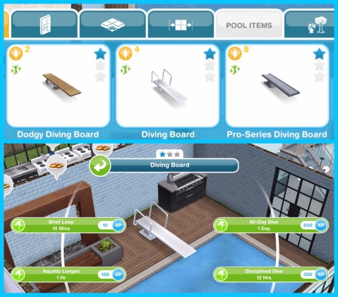 Your preteen, teen and adults sims will be able to complete the diving hobby once you complete the It’s All Going Swimmingly Quest to build the swim center, once built your sims can click on the diving boards and select one of the options: