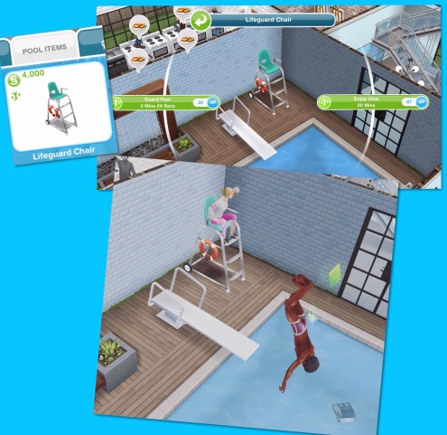 - The second time unlocks a lifeguard chair for you to use around the pools in your gardens (it costs S4,000 and can be found in the pool items section of the home store)