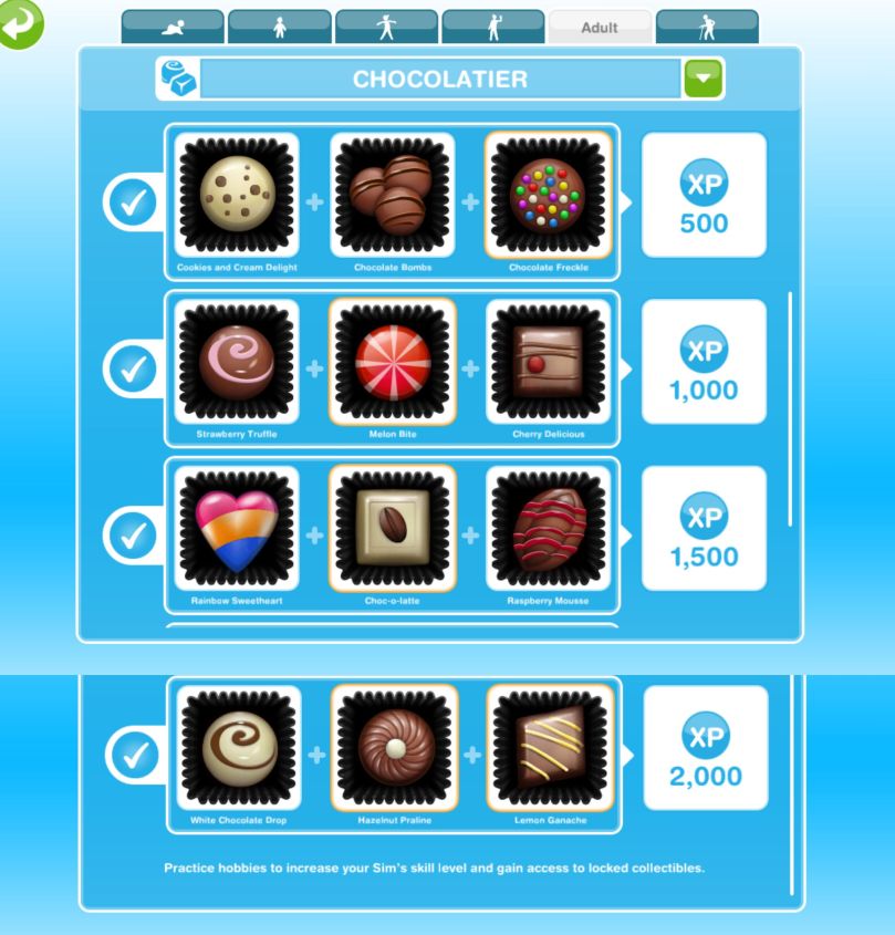 After the time has passed come back and click the exclamation mark above your sims head to find one of the chocolate collectibles. Every time your sims complete one of the options above their chocolatier hobby skill level up percentage will increase, once they reach 100% they will level up, there are 6 levels. You need to reach level 6 to be able to unlock all of the chocolate collectibles, once unlocked you will be able to find them.