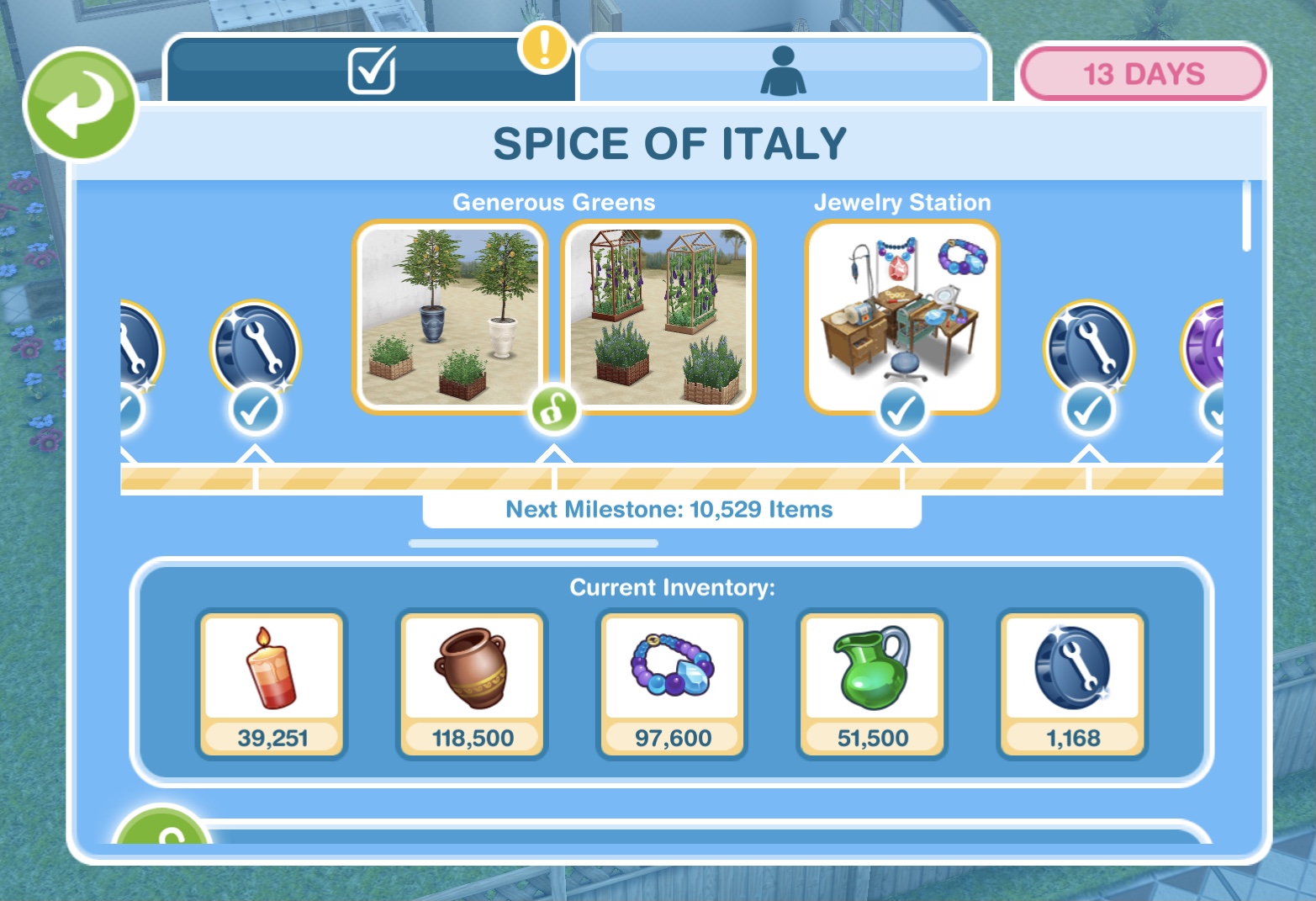 Laura Craft? You may have noticed at the front of one of your houses there is a board with a bubble of a person holding arts and crafts items above it, this is Laura Craft, you can buy her for real money to help you complete the event. When you buy her, you select the item you want her to make from the options: 200 candles, 300 pottery, 450 jewelry or 500 glassware (the amounts seem to differ for most of you and I have no idea why that is!) (you will unlock all the options once you have unlocked all the stations) and you will be able to collect them after 2 hours.