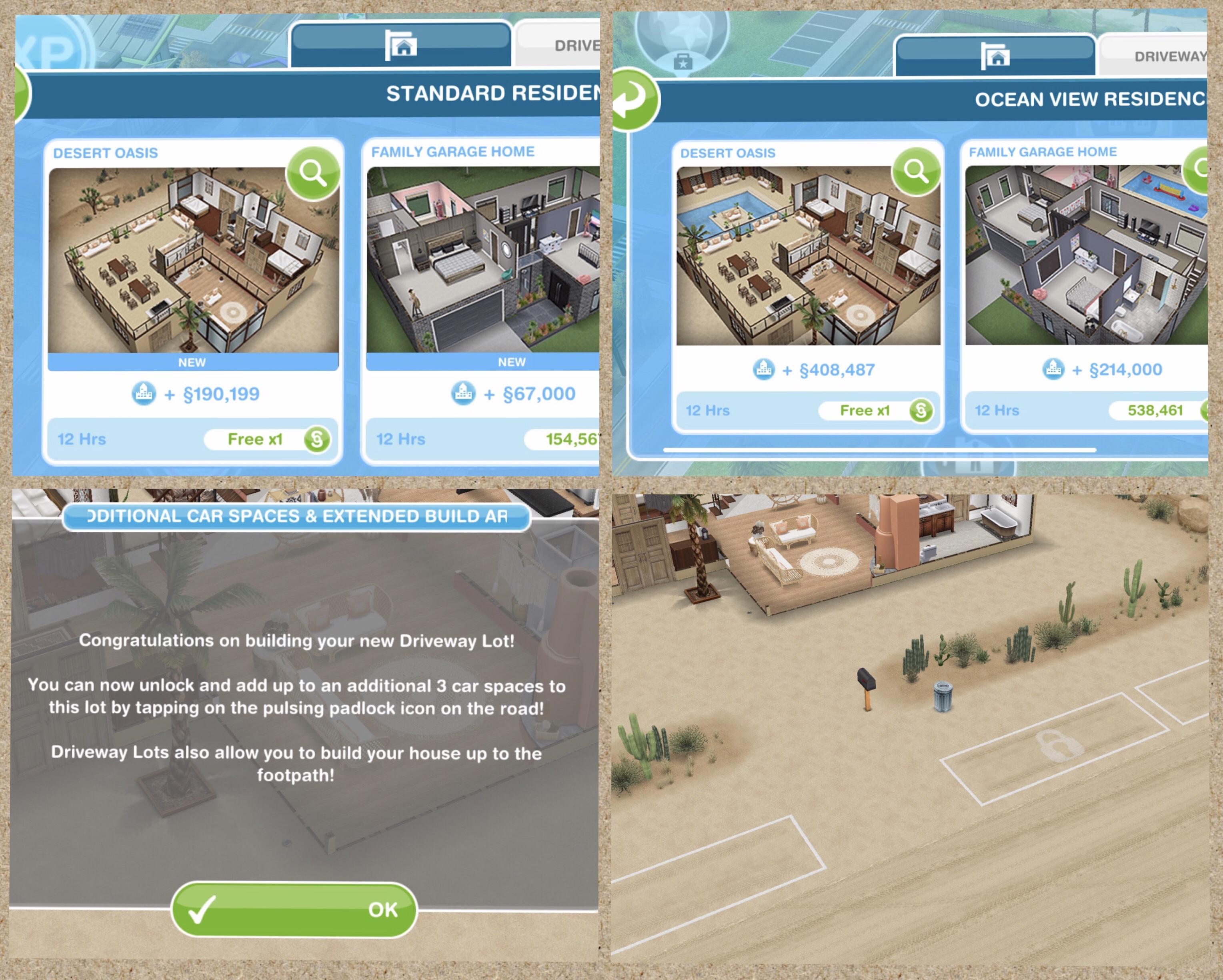 This template can be found under the driveway homes tab and built on a standard or premium residence, the first one is free then they cost simoleons depending on how many houses you have already built. You can add up to 4 cars to this house lot!