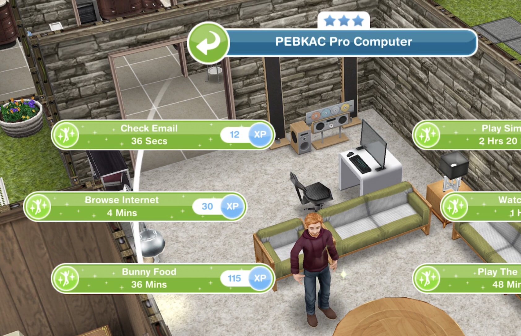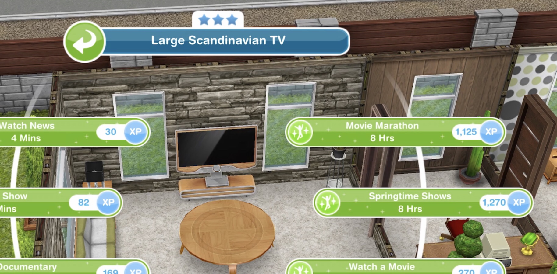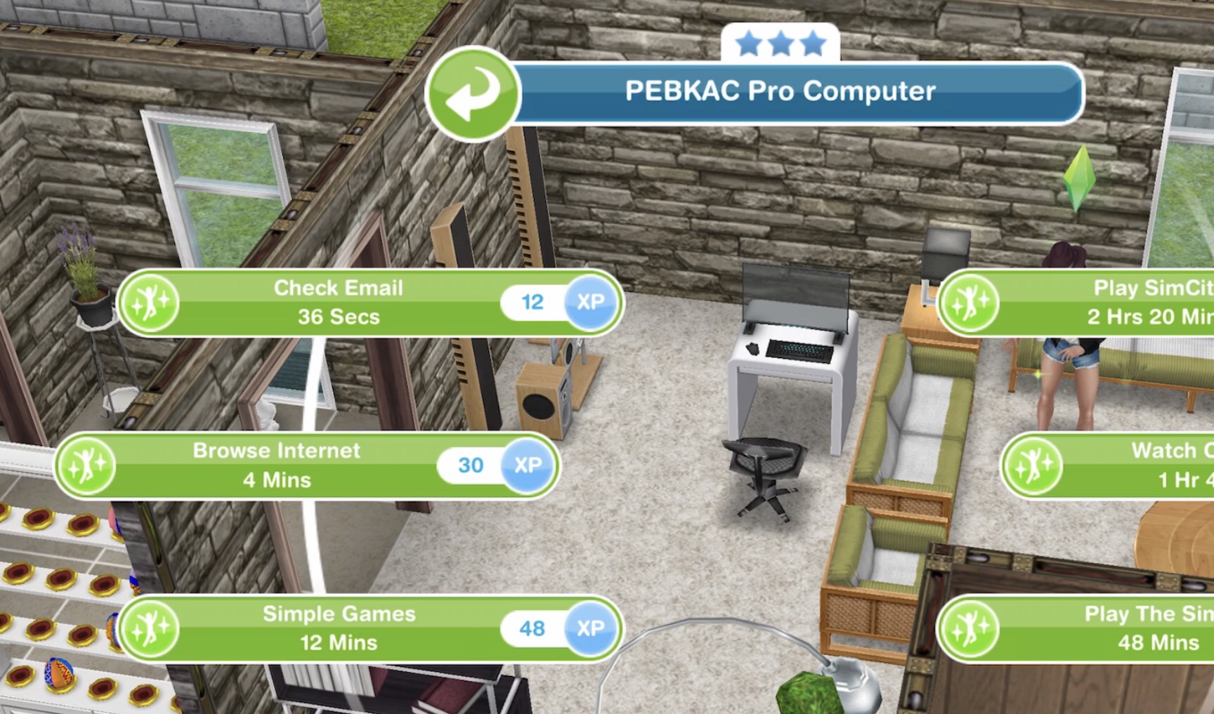 | Ponder Stardom 9 times (couch) (can use multiple sims) | 3 hrs 40 mins INSPIRED: 3 hrs 29 mins | 4 hrs INSPIRED: 3 hrs 48 mins | 4 hrs 30 mins INSPIRED: 4 hrs 17 mins | 146SP |