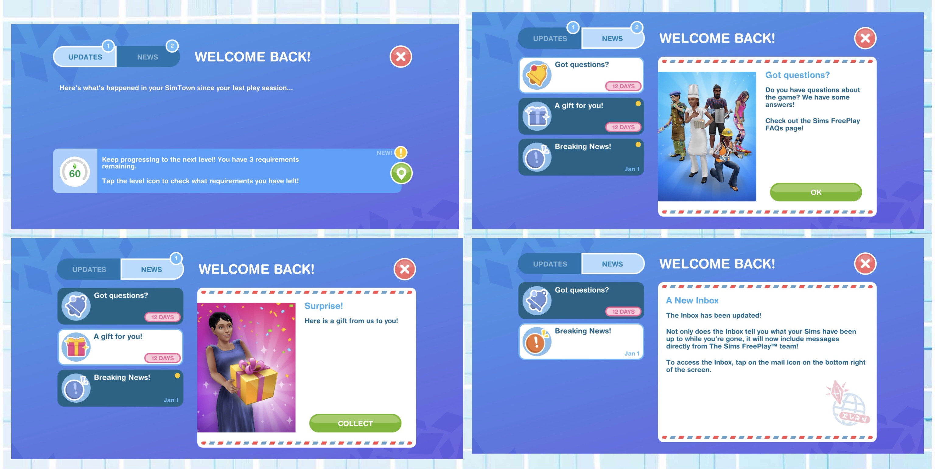 The inbox has had a makeover- you will now easily be able to see messages from The Sims Freeplay team including news updates, community content spotlights and gifts: