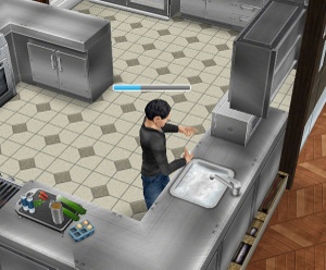 To tidy up you need to click on the sink in the kitchen and select keep cleaning dishes- 10 hours, this sim will then collect and wash up all dishes. Once all dishes have been cleared away they will stop the action. What else can you do at the restaurant?