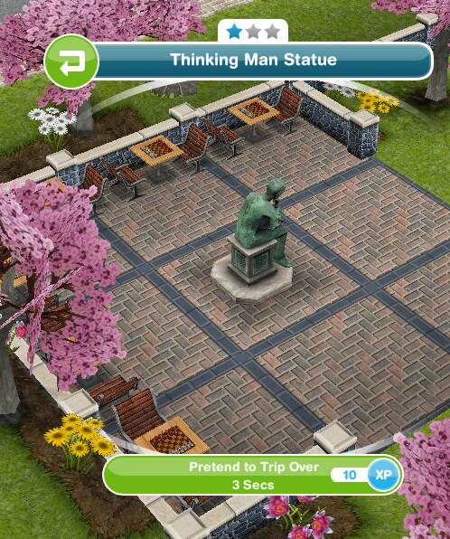 - Pretend to trip over- 3 seconds (click on thinking man statue in park)