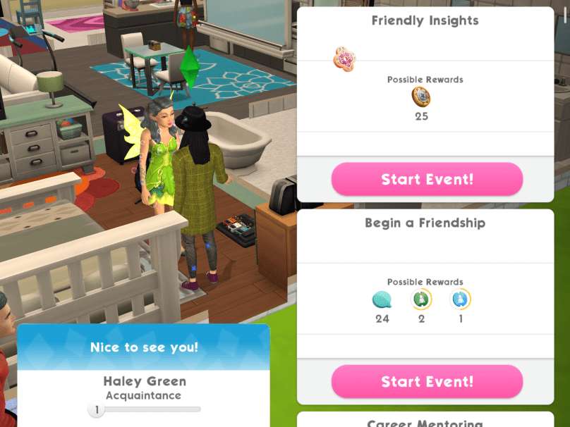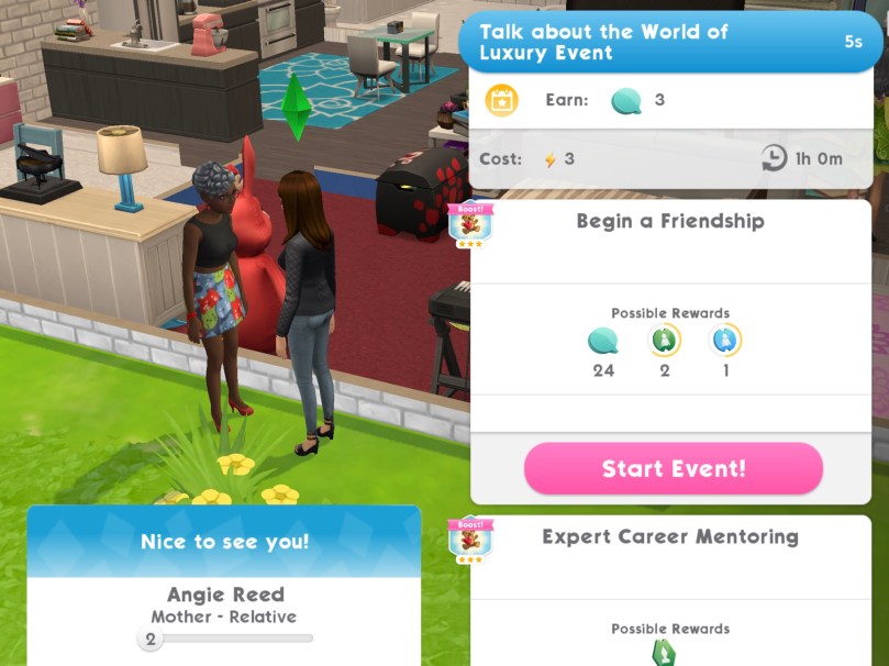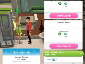 13.Complete the Friendly Insights event with another sim. You can complete this event every 8 hours Reward: 15 deluxe coins
