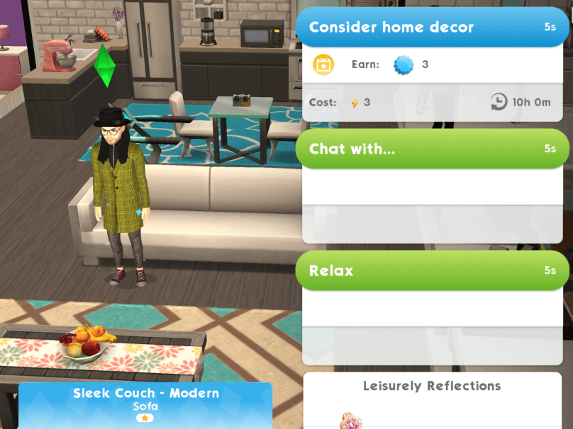 6.Tap on the sofa and consider your current home decor- 5 seconds, costs 3 energy Reward: 15 deluxe coins