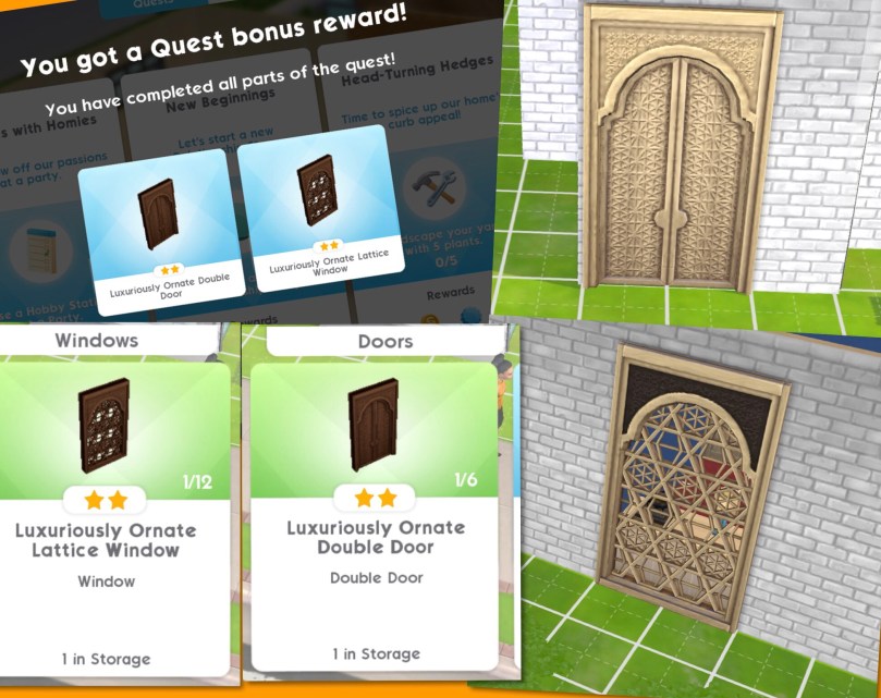 If you complete the whole quest you unlock the Luxuriously Ornate Double Door and Lattice Window
