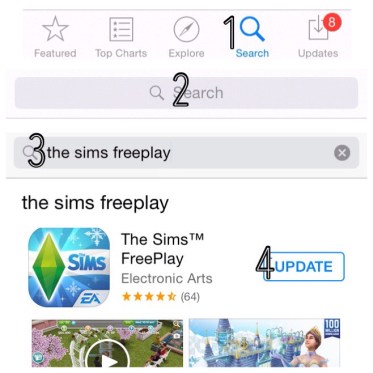 You can also update by searching for the game, to do this open the app store again, click the search button (1), type in sims freeplay in the search bar (3) and the game will appear with the option to update (4)