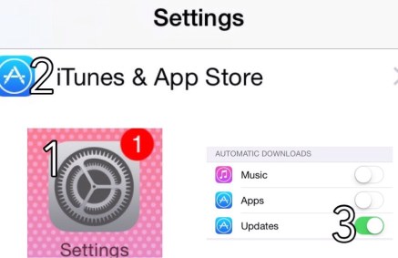 to itunes and app store (2) click on this and find the section titled automatic downloads, make sure the updates tab is turned on as shown in the picture (3)