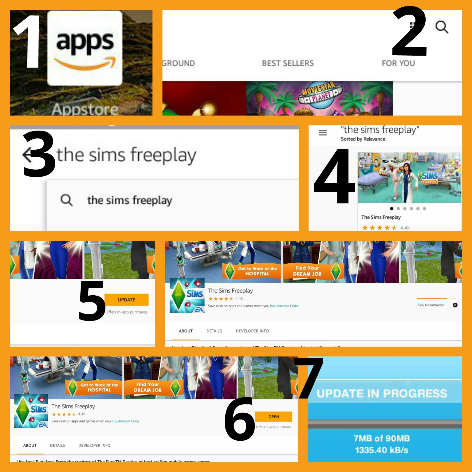 Open the appstore (1) and click on the search symbol on the top right hand corner (2), type in the sims freeplay and click search (3) and the game will appear click on it (4), to get the option to update (5) once updated click open (6) and it will update your new content before you can continue playing (7)
