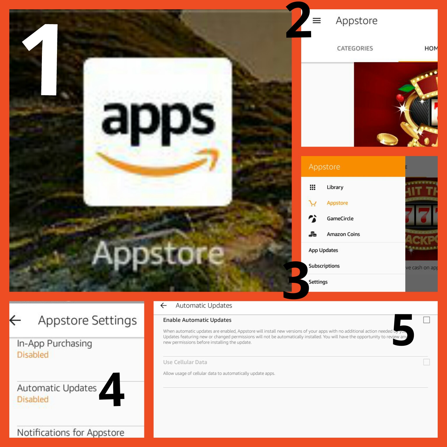 On a kindle you need to go to the appstore (1) click on the lines symbol next to where it says appstore (2) and a slide out menu will appear, you can then click on settings (3) and the second setting is automatic updates, (4) click on this and click the tick where it says enable automatic updates (5)