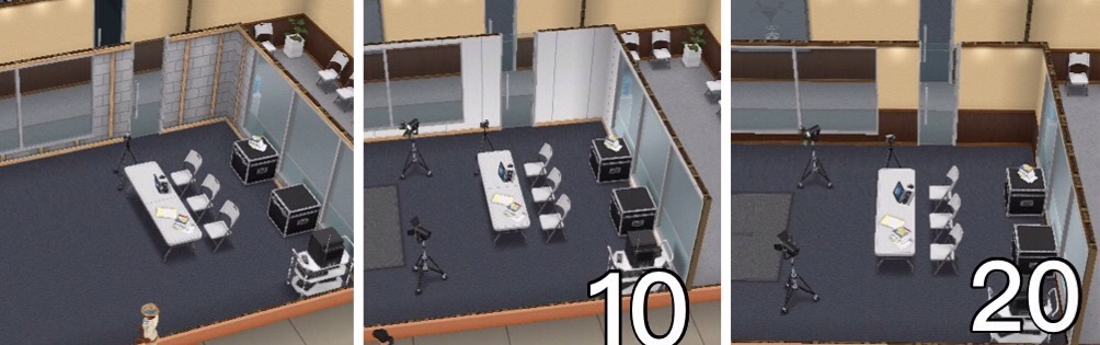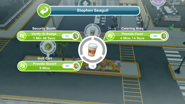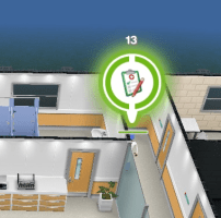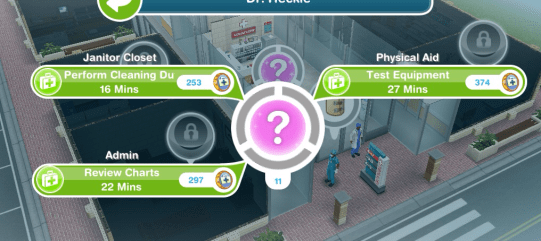 Each of these tasks has to be completed in a different workstation so your sims perform cleaning duties using the janitor closet, you need to use the admin workstation to review charts and you test equipment using the physical aid workstation.