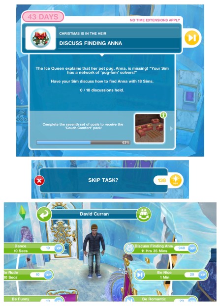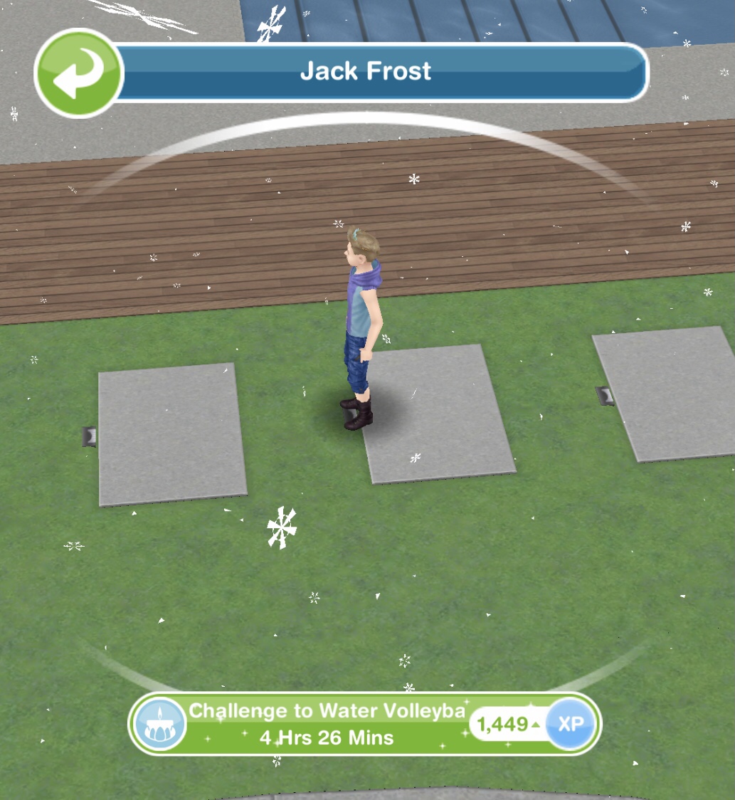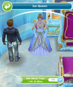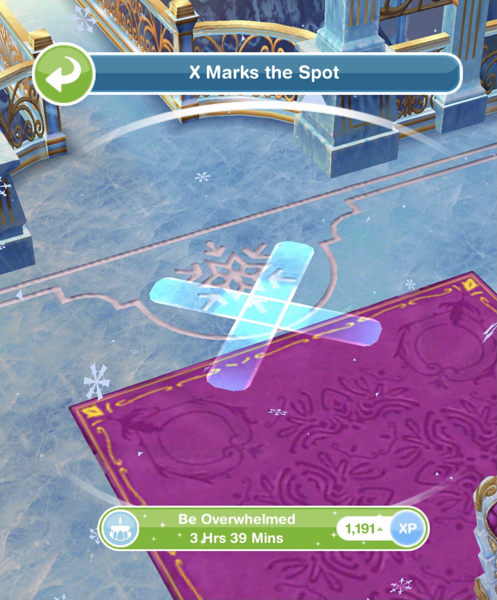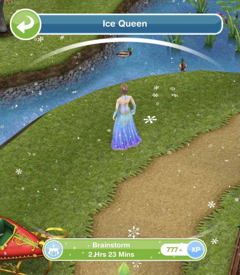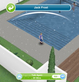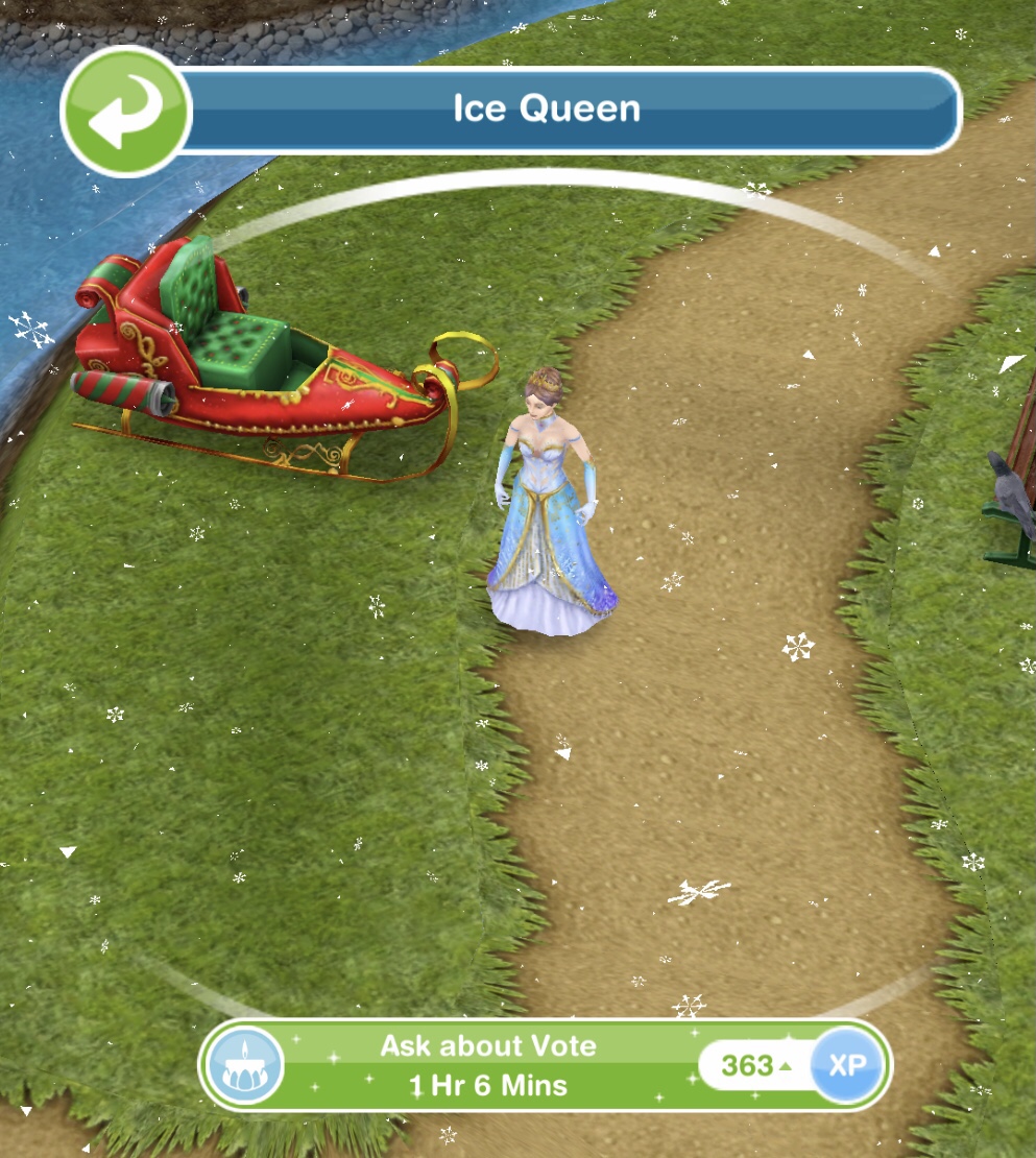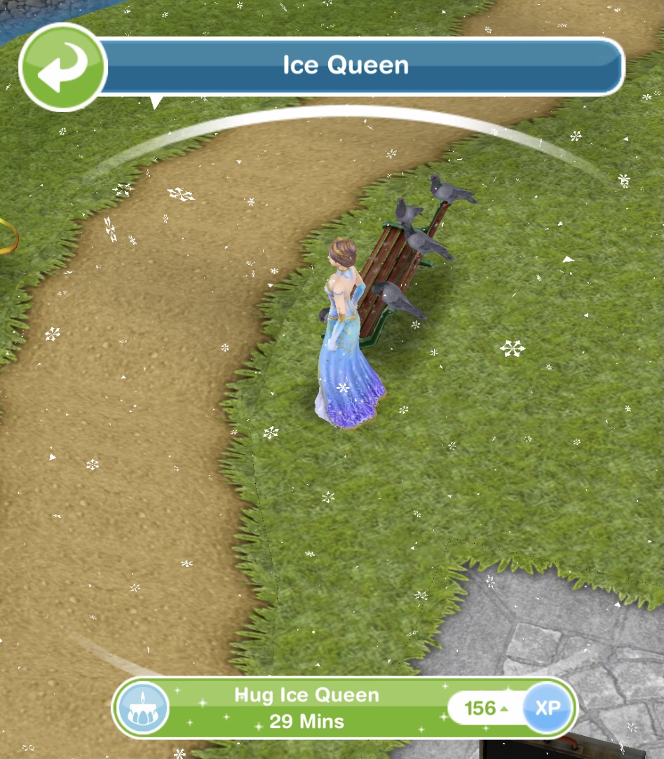 - Review snow schedule 14 times- 2 hours [inspired: 1 hr 54 mins] (click on the Ice Queen with 14 sims to get this option)(can skip all with 12 LP- need to earn LP quickly?)