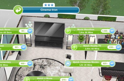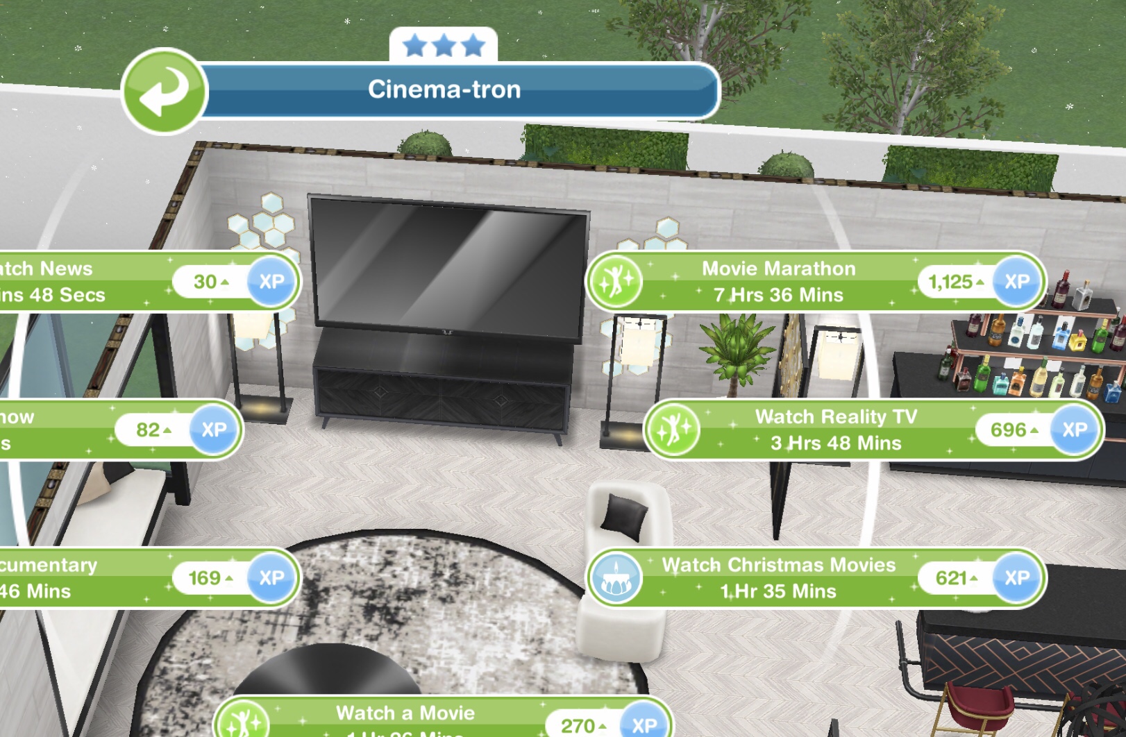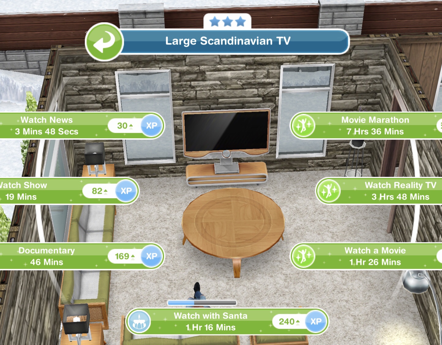 - Relax at a TV- 1 hour 12 minutes [inspired: 1 hr 8 mins] (using a 3 star tv at a sim’s house)