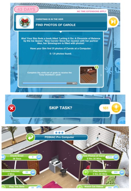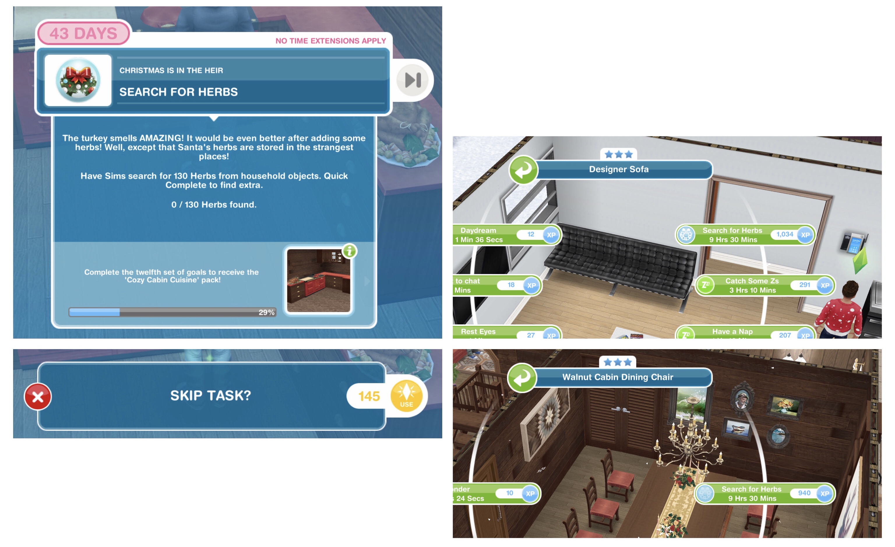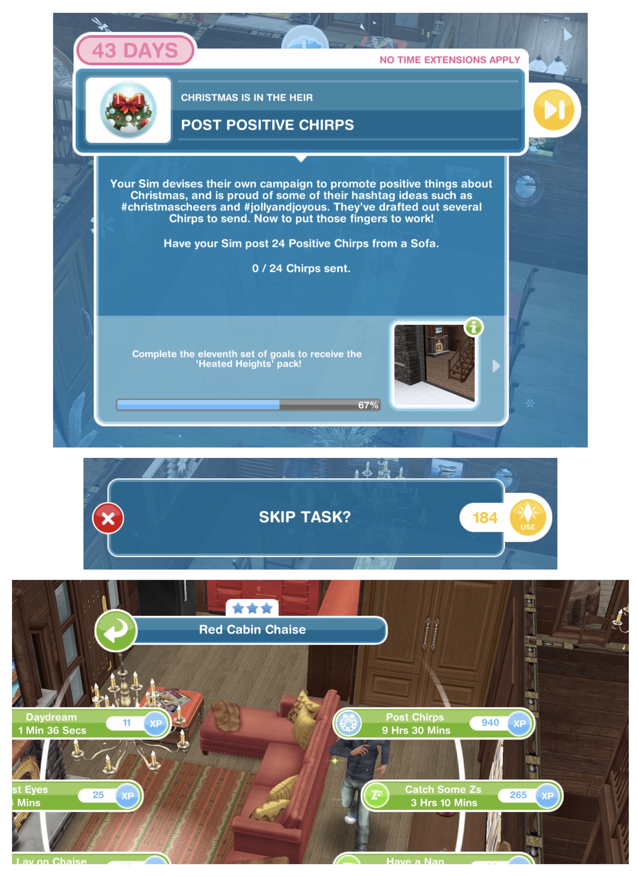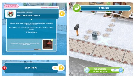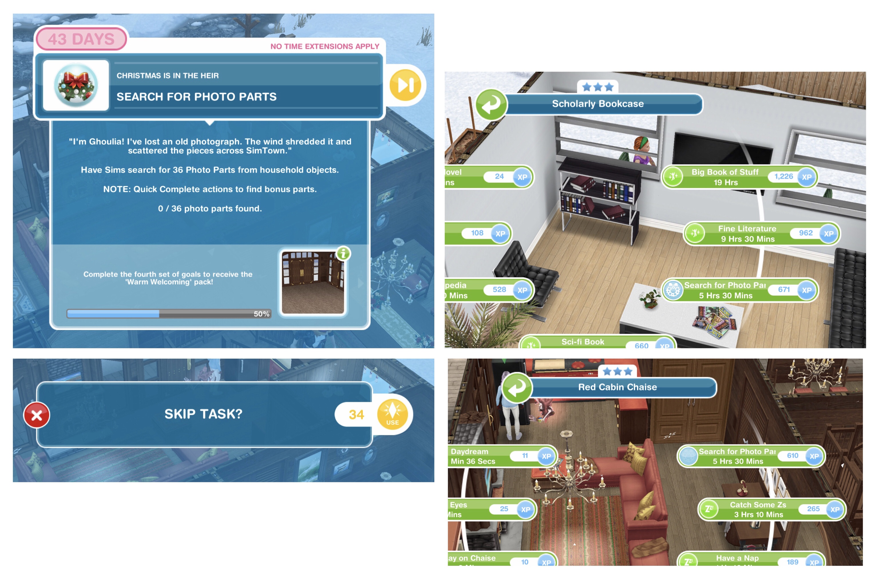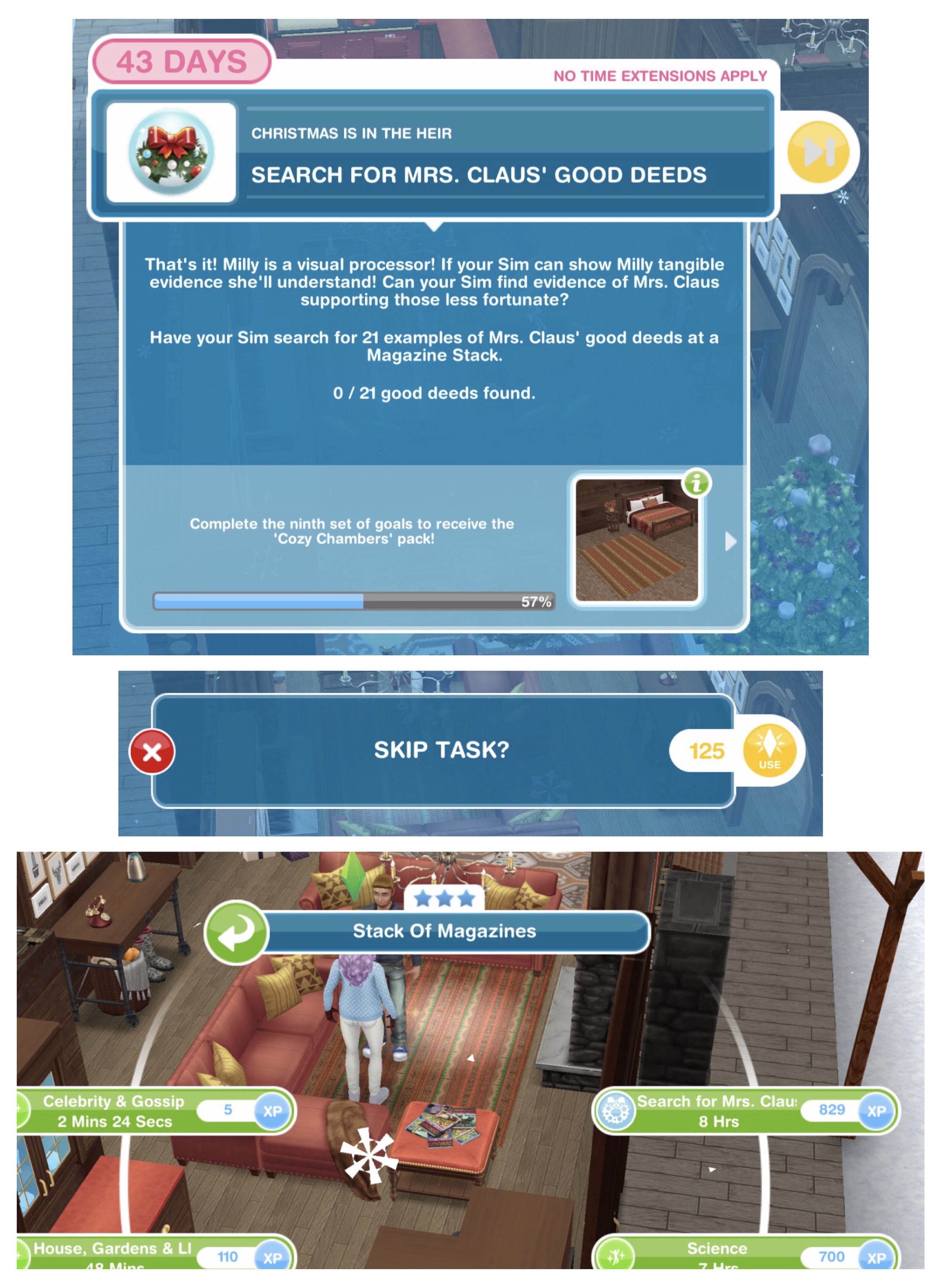 - Find 150 stocking fillers- 24 minutes [inspired: 23 mins] (select this option on objects around your sims houses) NOTE: there is no maximum on how many sims you can have completing these tasks that require multiple sims so have as many as possible completing them