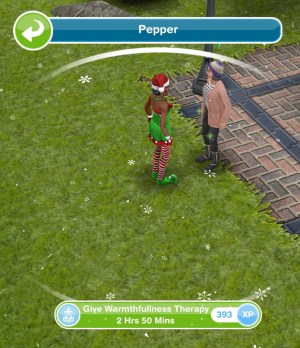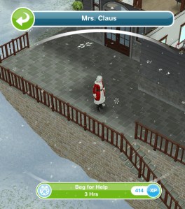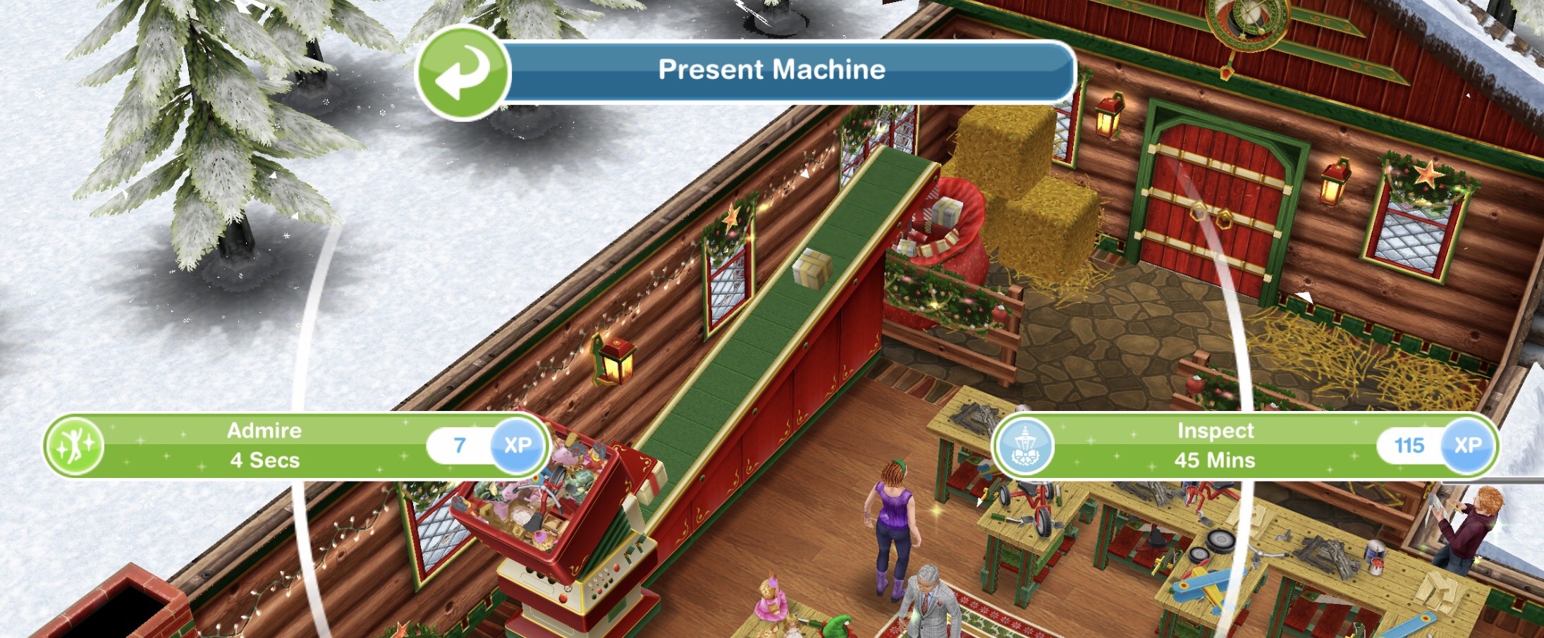 Give the elves a ‘ho ho ho’- 4 hours (click on X)(only adult sims can do this)