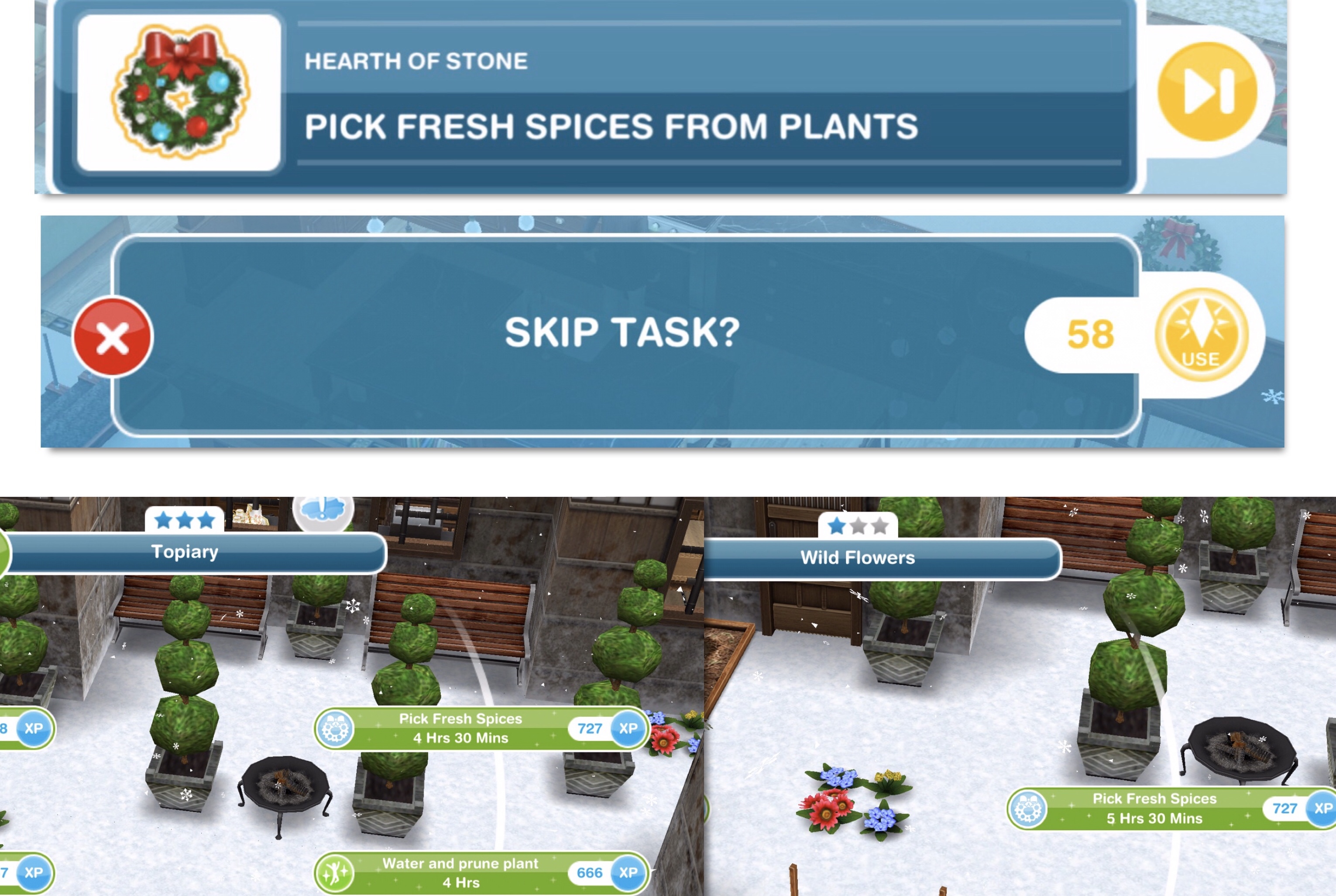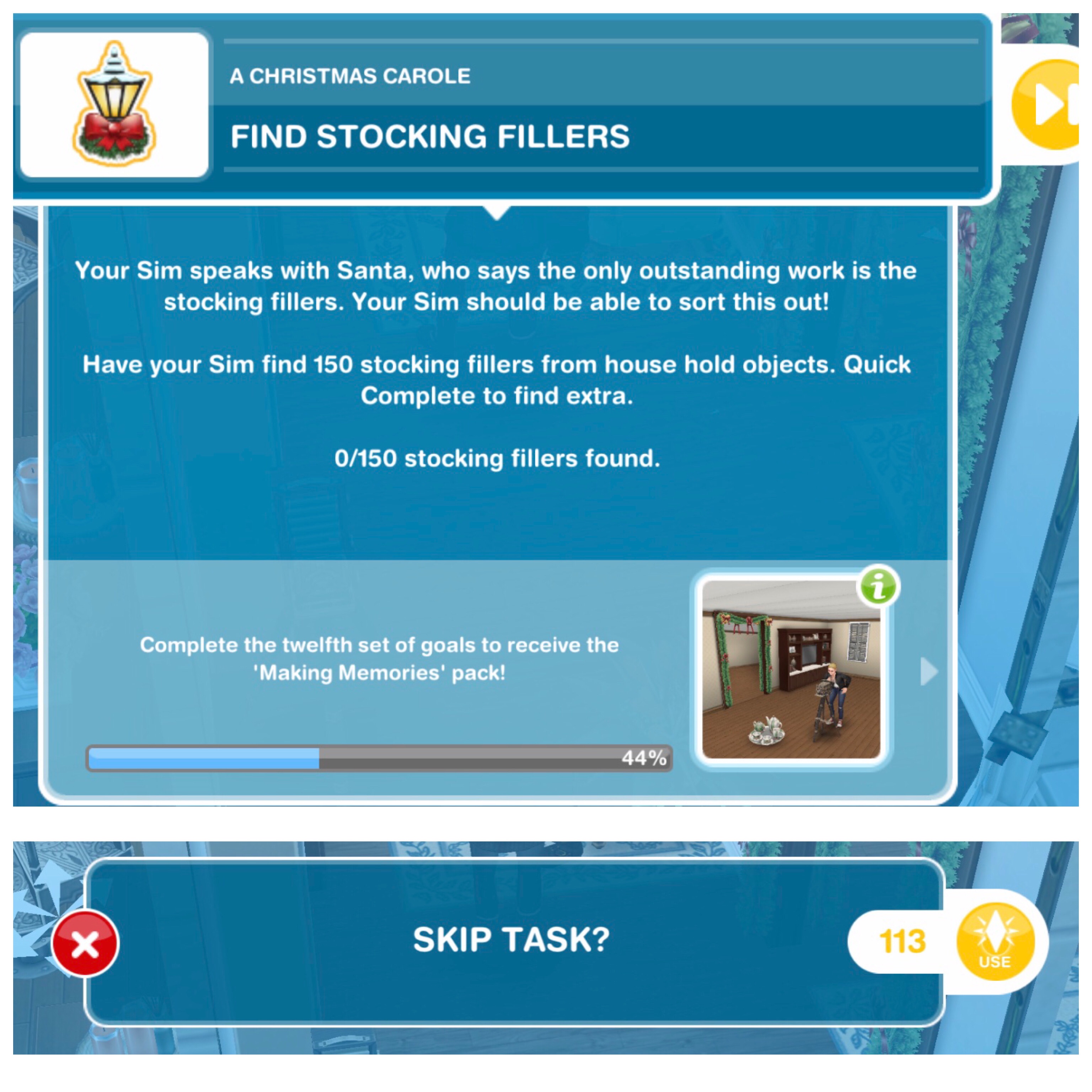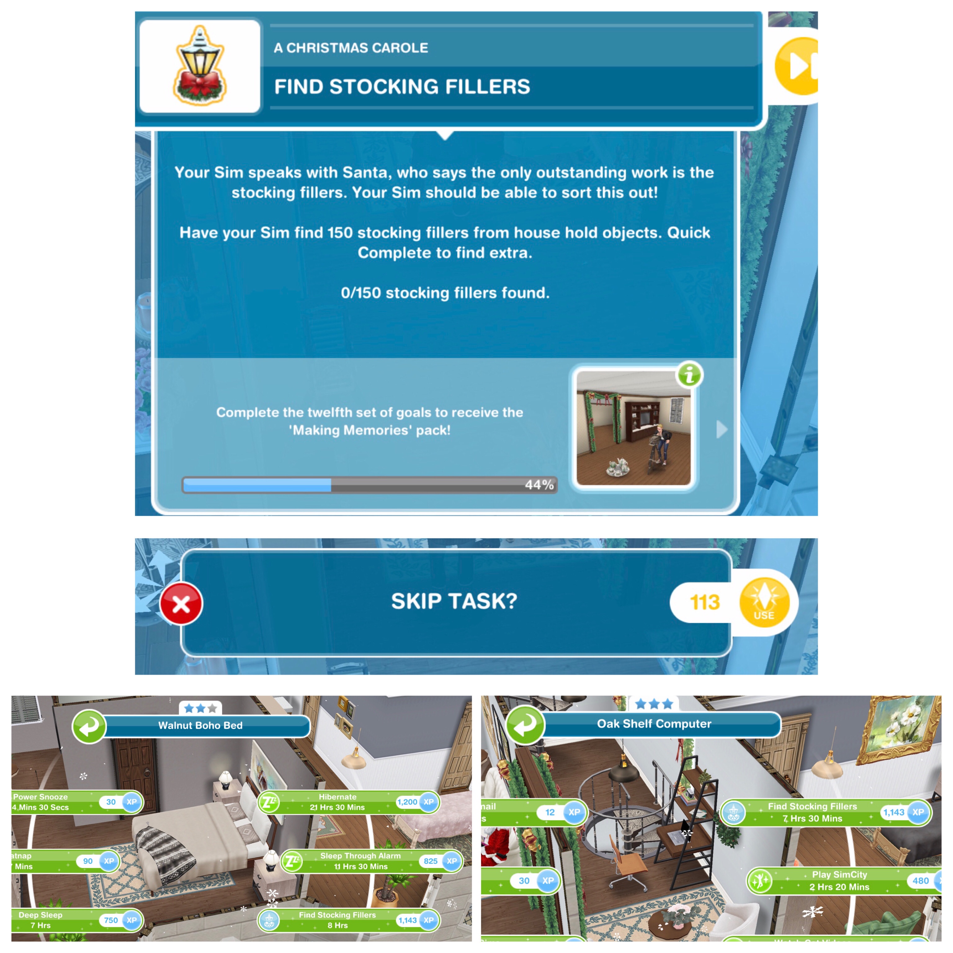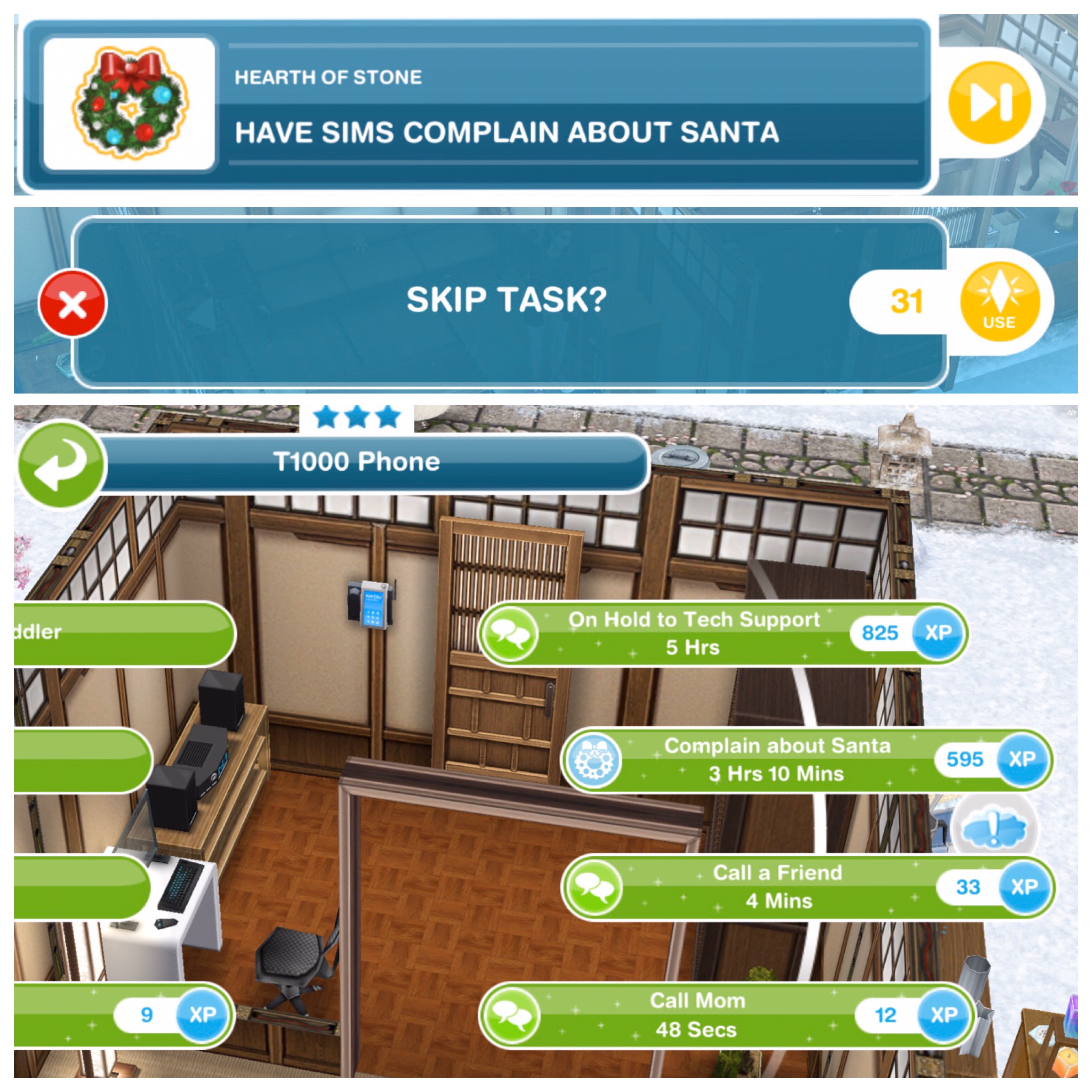 TIP: there are lots of tasks that need to be done more than once, this year you can use LP to skip all these tasks or you can still use the maximum sims you can to complete the task but remember if you just use one sim you will run out of time (the amount of sims you need to complete an action will probably vary depending on the level you are on but the amounts shown in this post are the maximum)