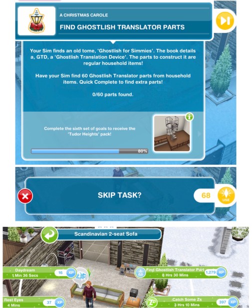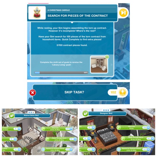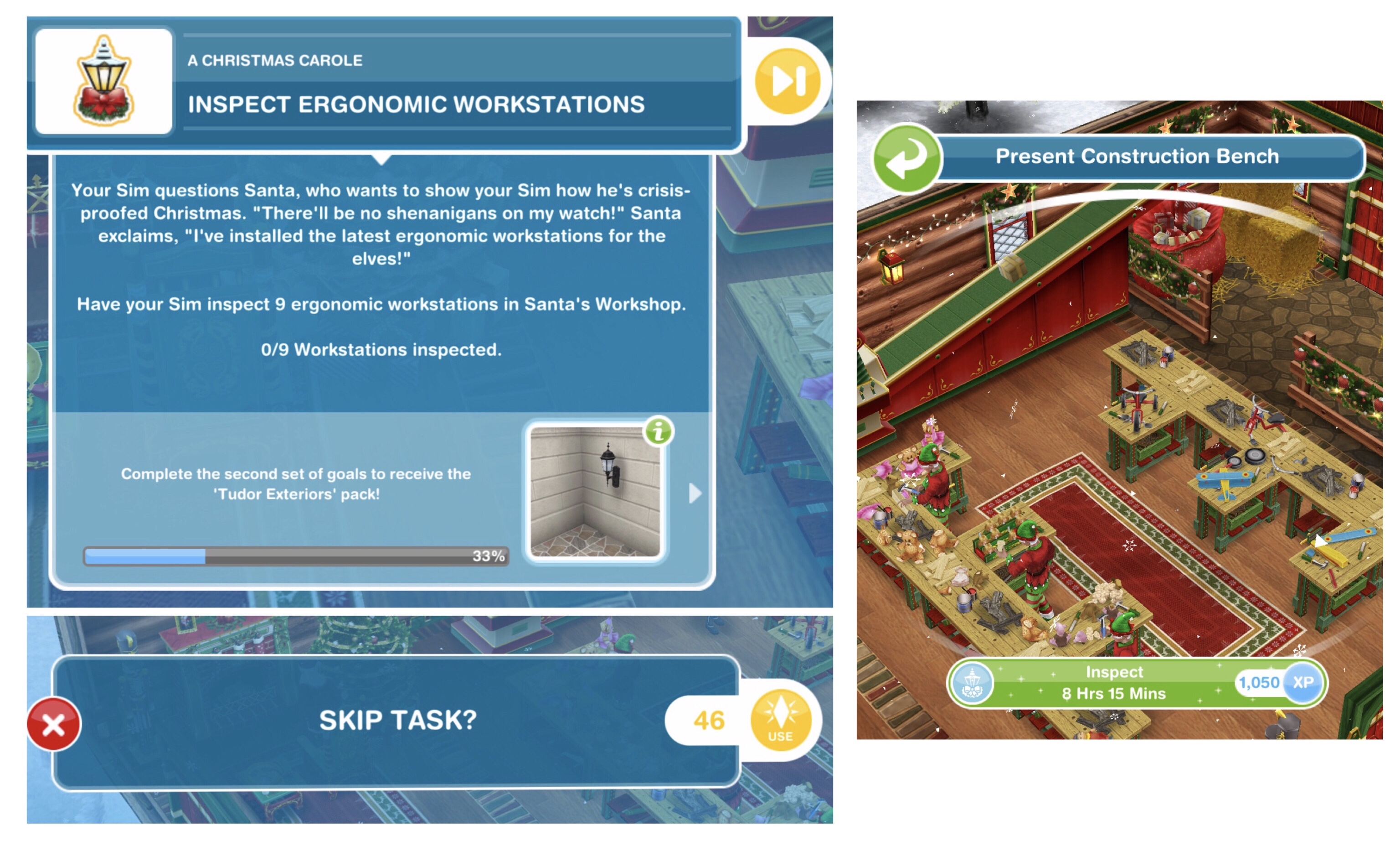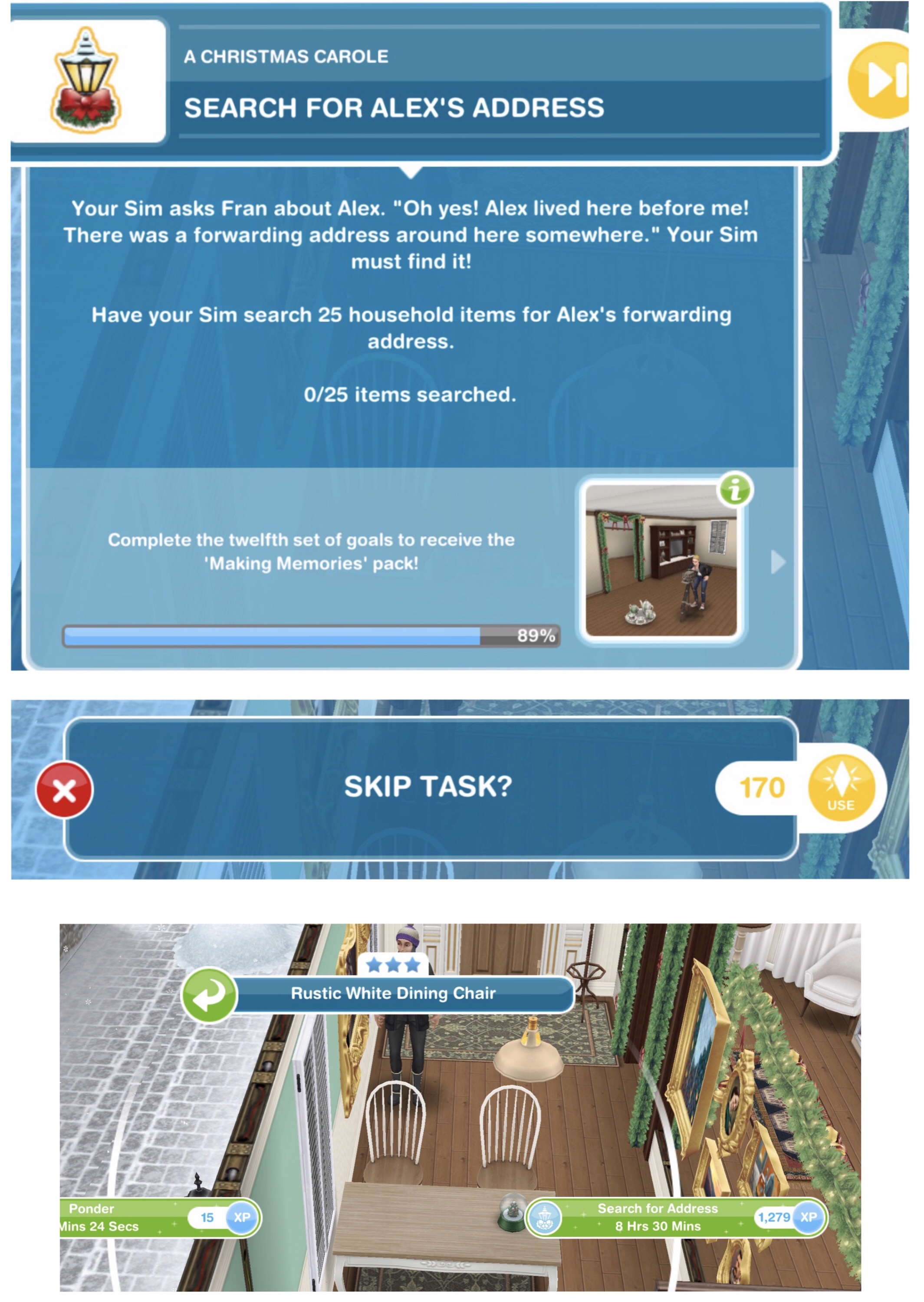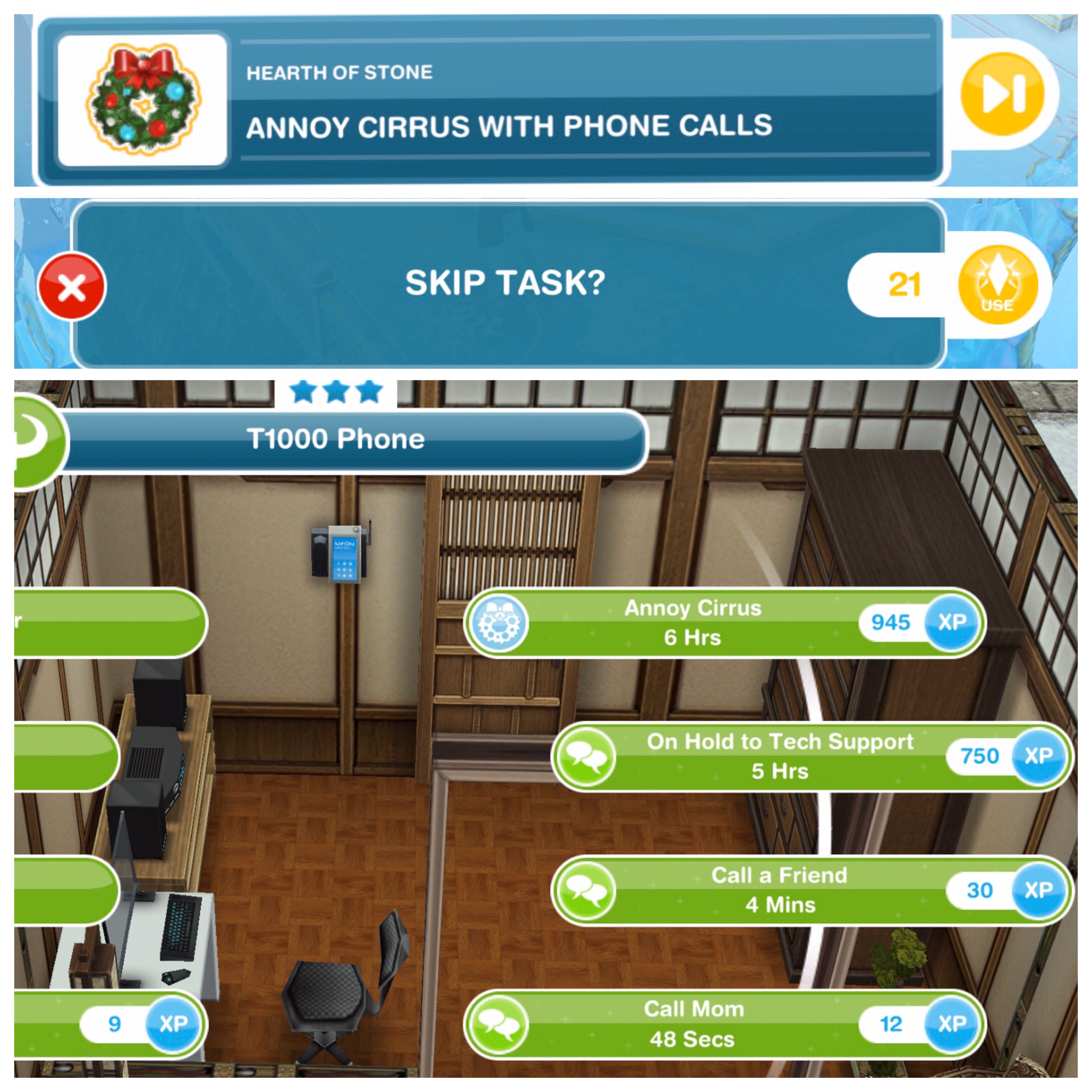 TIP: there are lots of tasks that need to be done more than once, this year you can use LP to skip all these tasks or you can still use the maximum sims you can to complete the task but remember if you just use one sim you will run out of time (the amount of sims you need to complete an action will probably vary depending on the level you are on but the amounts shown in this post are the maximum)