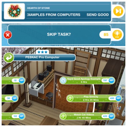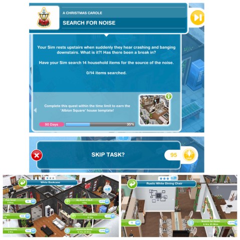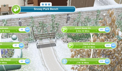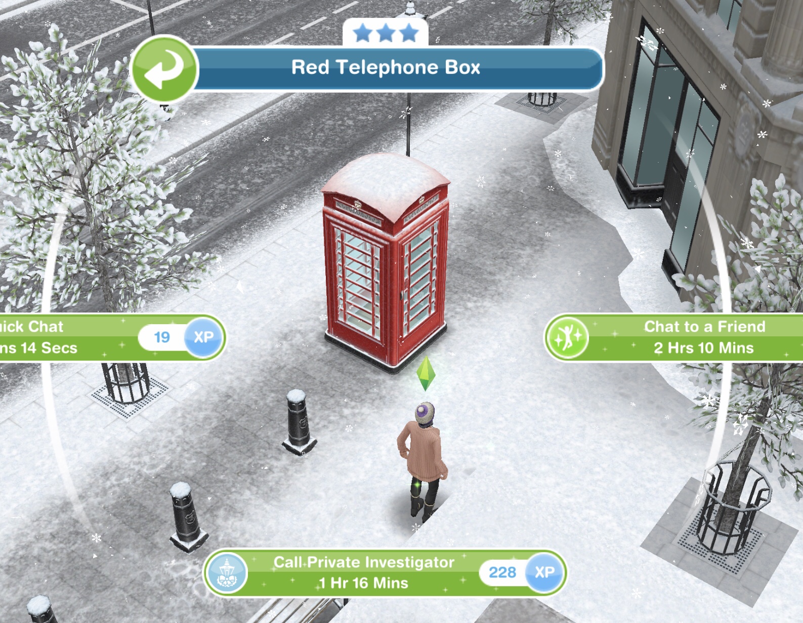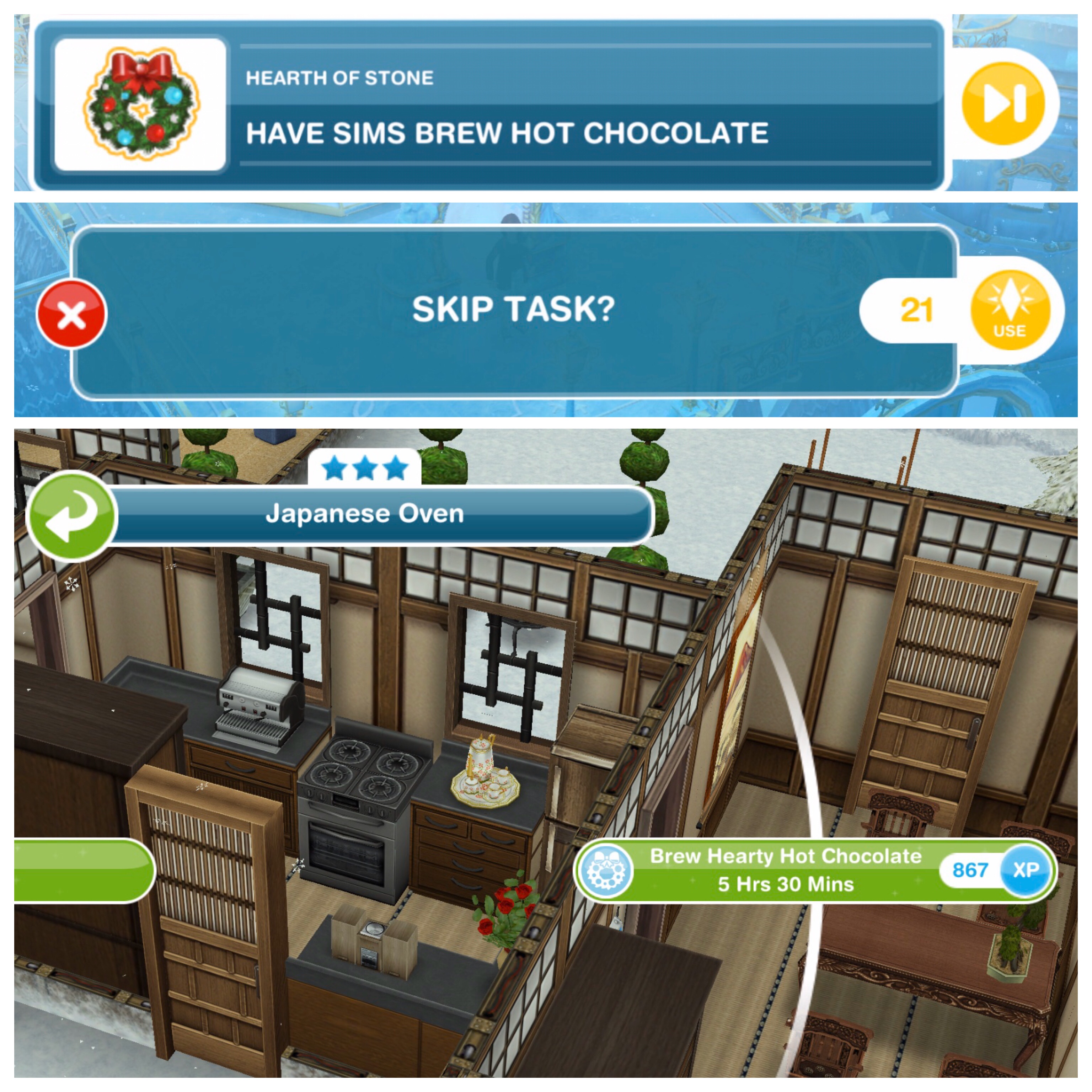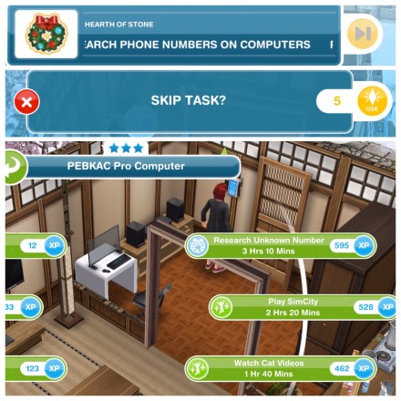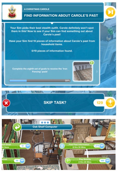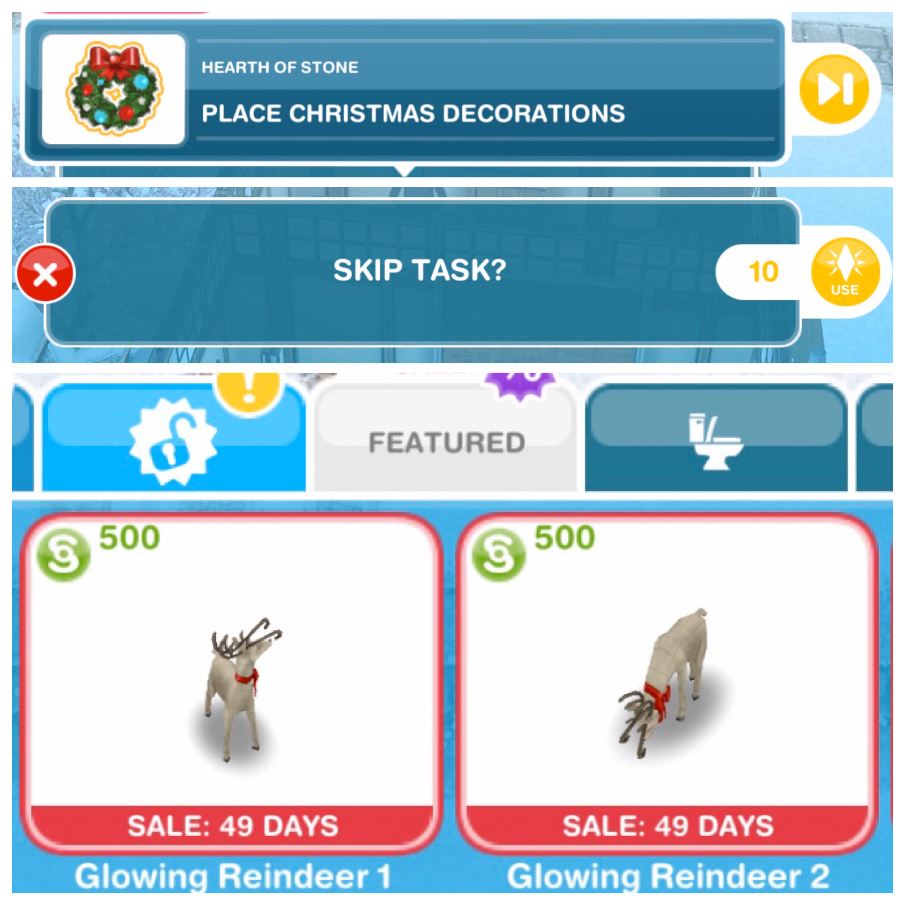 TIP: there are lots of tasks that need to be done more than once, this year you can use LP to skip all these tasks or you can still use the maximum sims you can to complete the task but remember if you just use one sim you will run out of time (the amount of sims you need to complete an action will probably vary depending on the level you are on but the amounts shown in this post are the maximum)