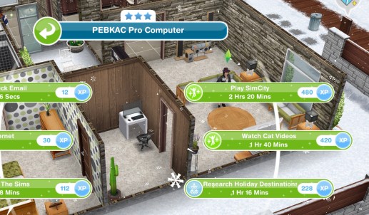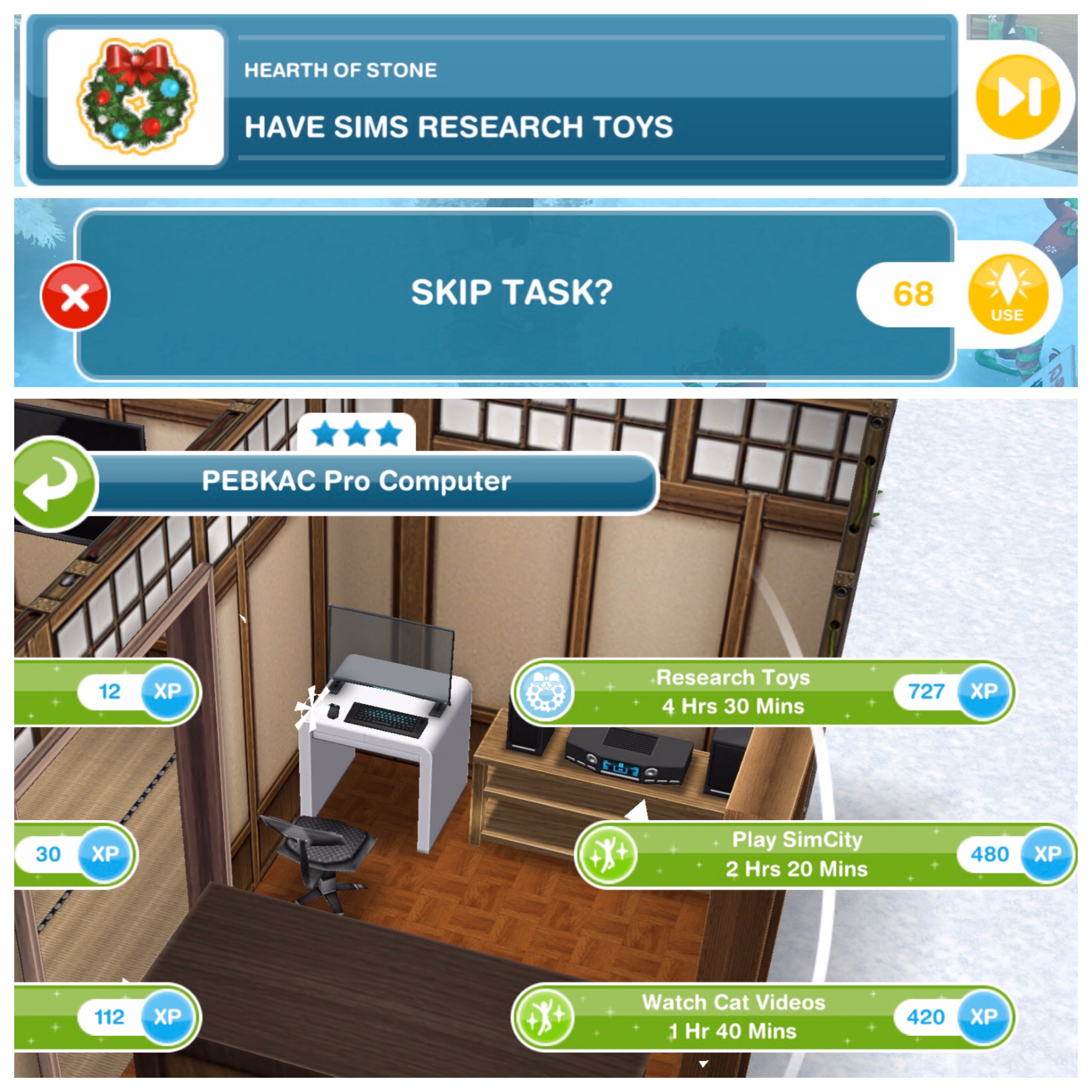 Have 20 sims research toys- 4 hours 30 minutes (using a computer)(can skip all for 68LP- need to earn LP quickly?)