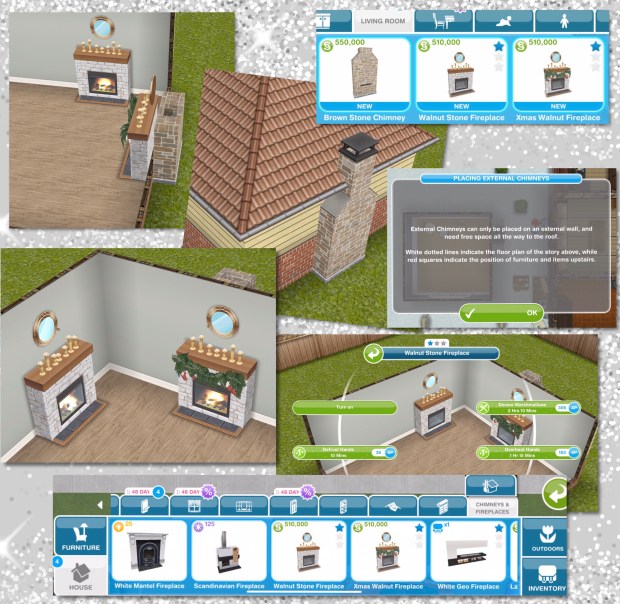 The chimney needs to be placed on the exterior (outside) of the house, you can only place the chimney on the ground floor (or on a balcony) and cannot place it if there is something in the way above where you want to place it (red squares will appear)