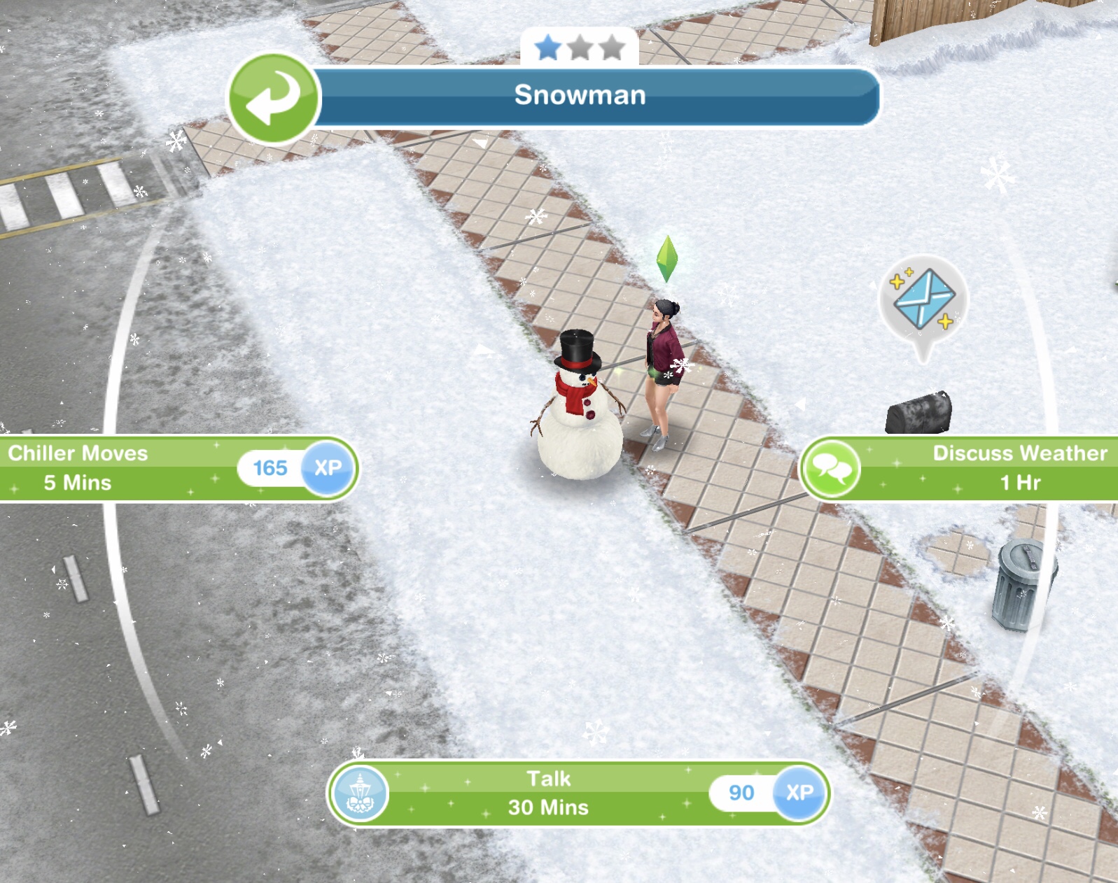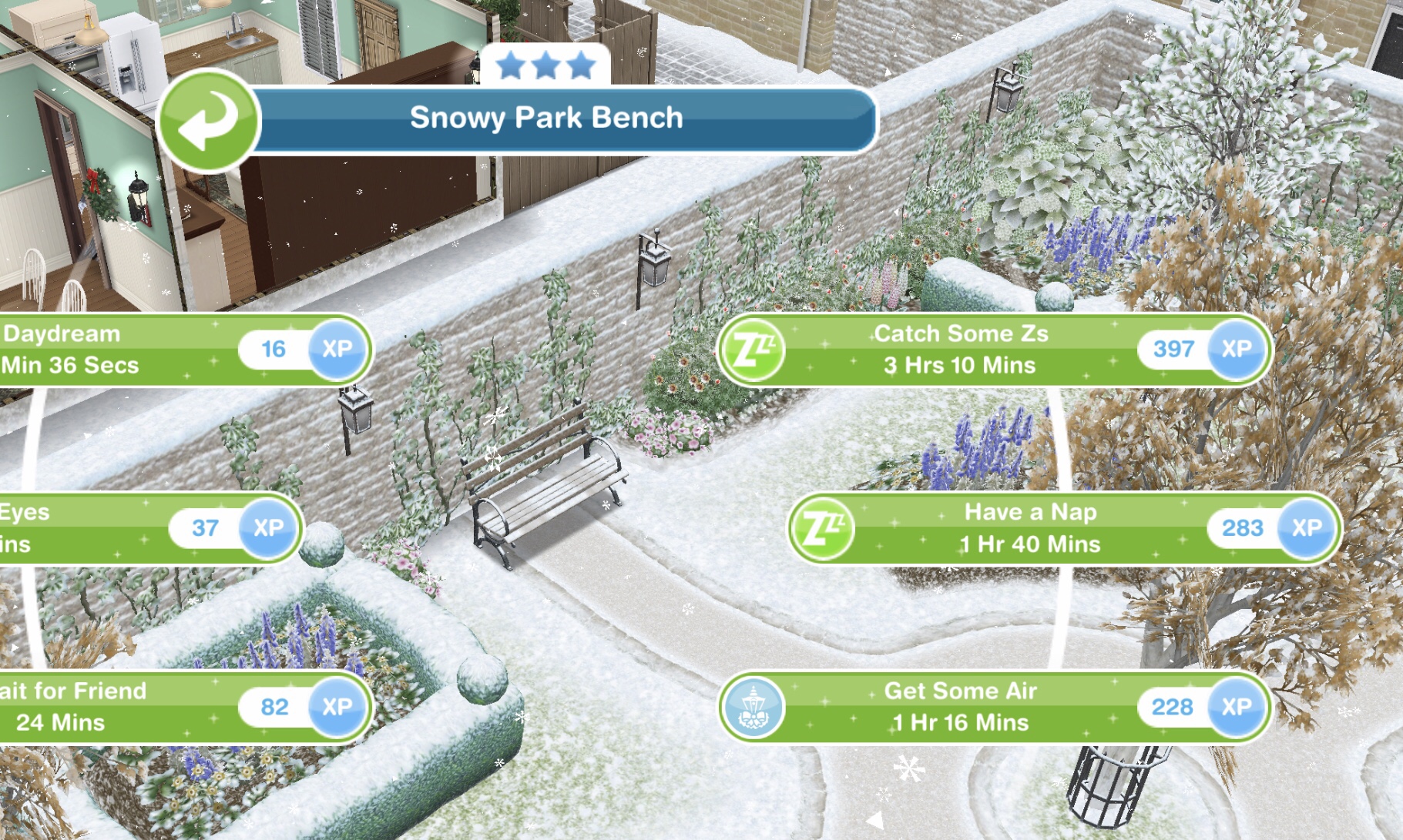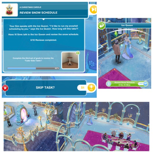 Review snow schedule 10 times- 8 hours 15 minutes (click on the Ice Queen with 10 sims to get this option)(can skip all for large amount of LP- need to earn LP quickly?)
