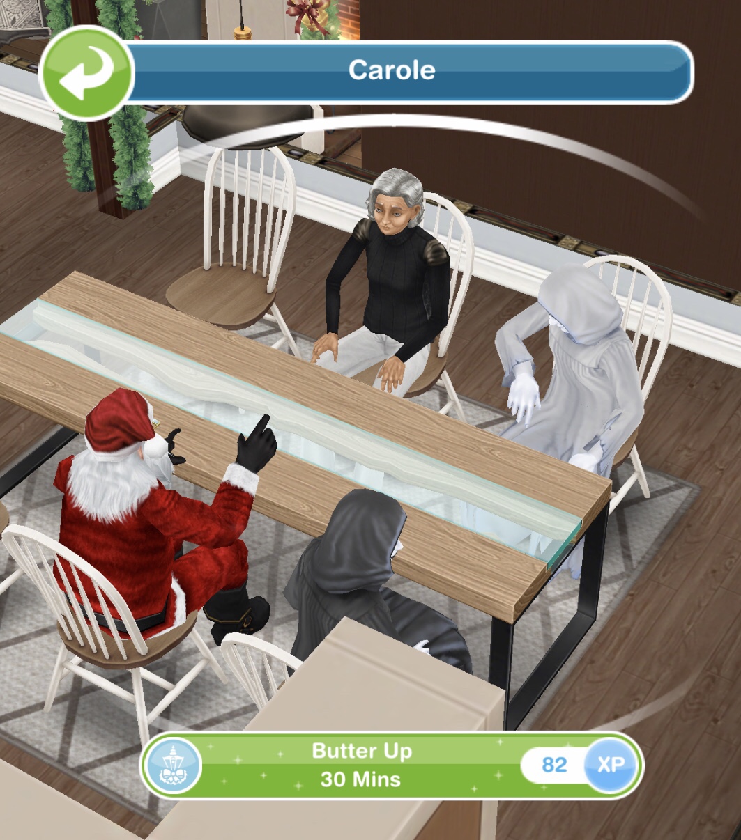 Give inspirational speech as Santa- 3 hours 10 minutes (click on X) (only adult sims can do this)
