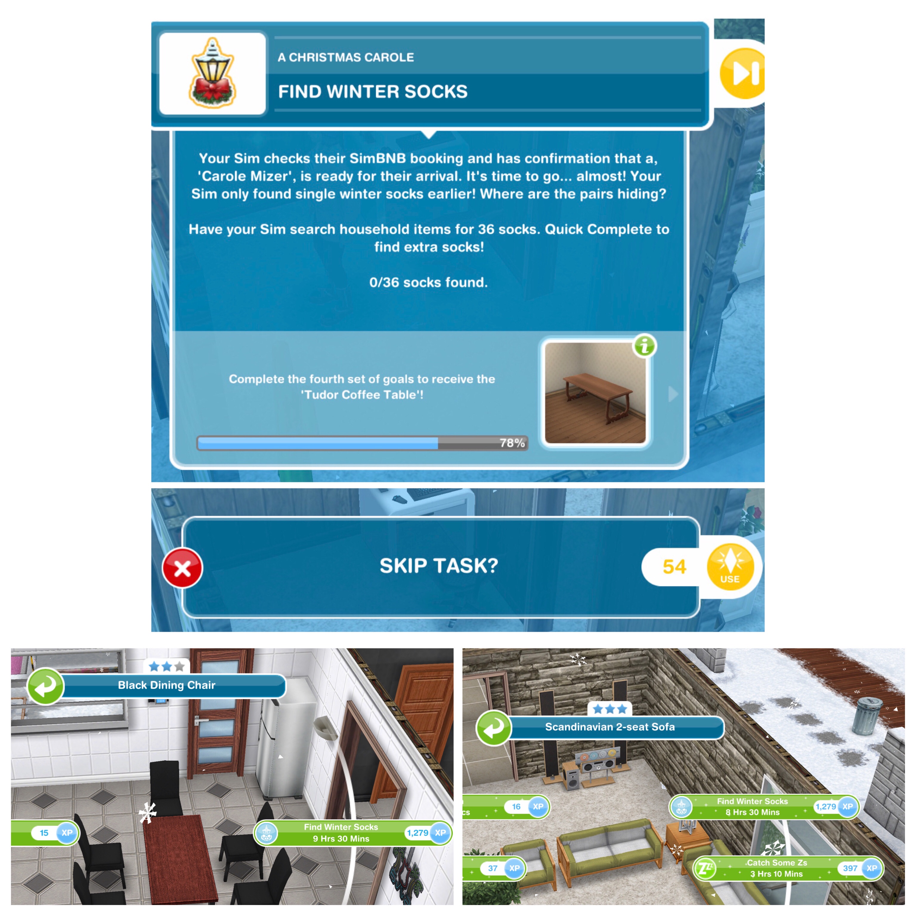 Find 36 winter socks- 8 hours 30 minutes (select this option on objects around your sims houses) NOTE: there is no maximum on how many sims you can have completing these tasks that require multiple sims so have as many as possible completing them