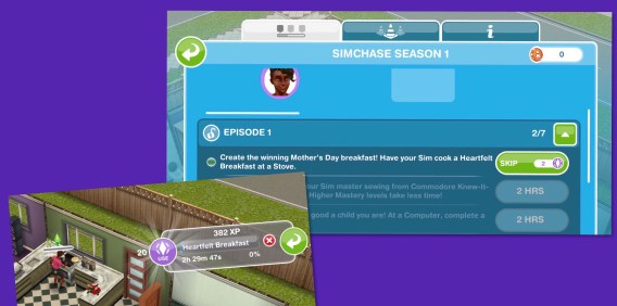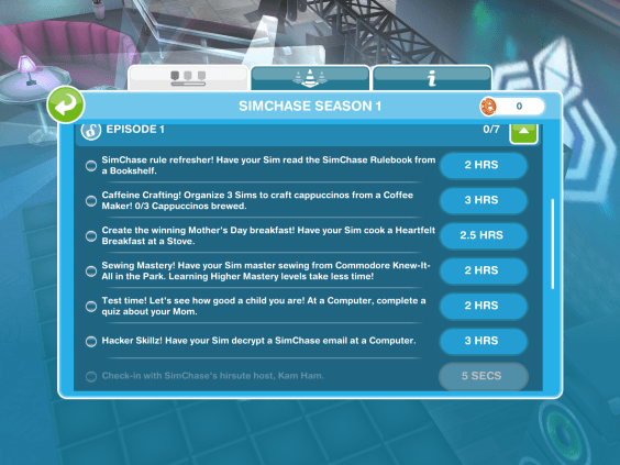 I found it incredibly difficult to write this post as I do not like the idea of SimChase events at all, they are just a complete money grab in my opinion. I completed this on the early access version and I am not even going to try and complete it on my actual game because it is just set up to make us fail unless we spend hundreds of SP! I added up the times for completing episode 7 and it would have taken me 23 hours without SP which is alright for the rival as they don’t need to sleep!! The mastery tasks are what annoys me the most, why should I pay thousands of simoleons or SP to be allowed to complete a challenge? I know they need to make money but they are becoming as bad as The Sims Mobile with their money grabbing actions, being forced to spend money does not make anyone want to spend money!