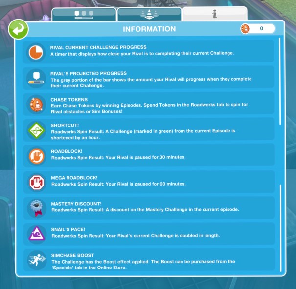 Chase tokens are used on the second tab in the SimChase menu to spin for roadblocks so you can progress faster or you can throw obstacles in the way of your rival sim to slow them down: