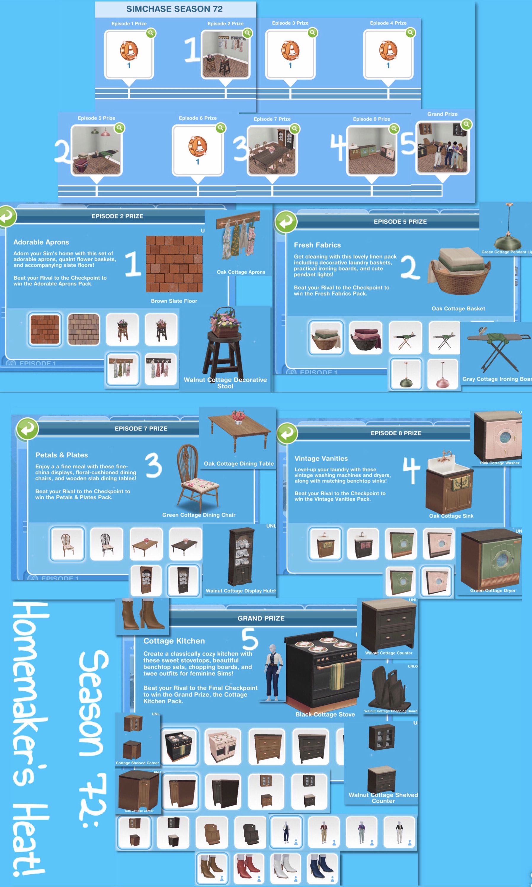 3 Star Rating: Oak Cottage Aprons (9SP) Black Cottage Ironing Board (8SP) Oak Cottage Basket (8SP) Green Cottage Dining Chair (5SP) Oak Cottage Dining Table (8SP) Green Cottage Dryer (16SP) Green Cottage Washer (16SP) Oak Cottage Sink (7SP) Black Cottage Stove (13SP) Oak Cottage Chopping Board (13SP)
