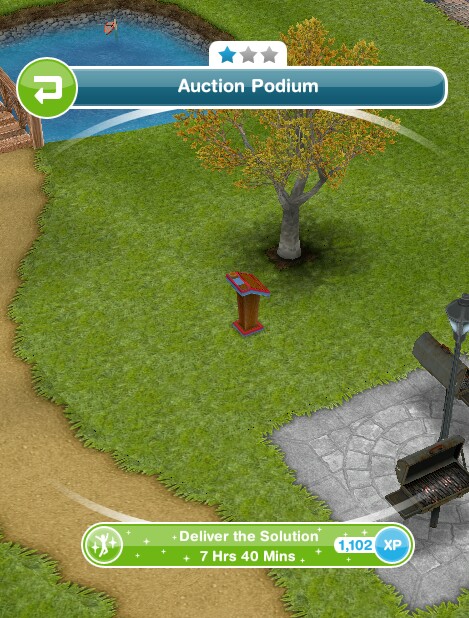 - Deliver the solution- 7 hours 40 minutes (click on the auction podium in the park) you can cancel the action for other sims to listen to the speech