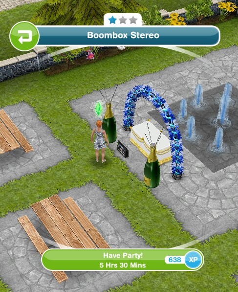 - Set up party- 8 hours 30 minutes (click on crates in the park- you need to click on all 3 with your 3 sims)
