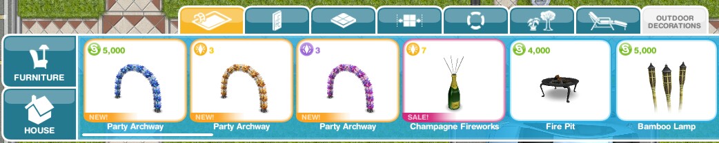 - Party archways and champagne fireworks (found in the outdoor decorations section)