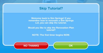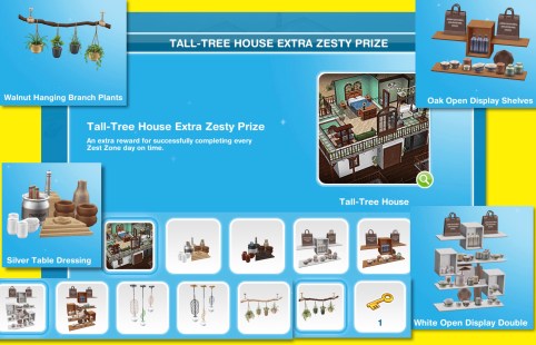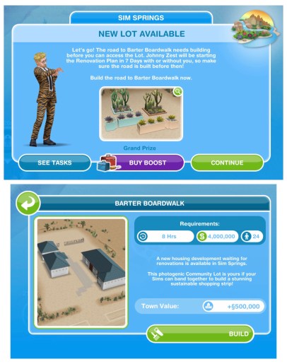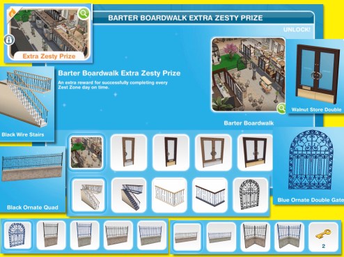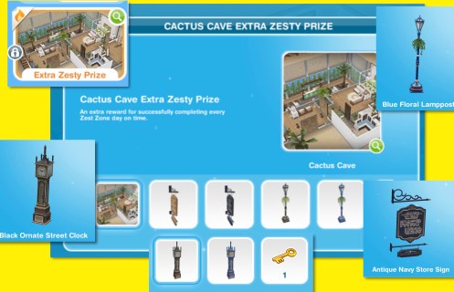 The lots need to be renovated in the order listed above, you cannot do up more than one lot at a time and the next won’t unlock until the previous one has been completed. The time limit to complete a house is 10 days (14 days for community lot) with tasks to complete each day in Sim Springs, similar to Downtown Developer Events if you don’t complete in the time limit you will have to pay to be able to move on but there are prizes available, the extra zesty prizes contains a house template that can be placed in Sim Springs or Simtown.