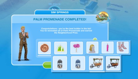 The second neighbourhood in Sim Springs, Palm Promenade is available. The aim of this event is to complete daily tasks to renovate house lots in the new neighbourhood, you will need to have completed the first neighbourhood, Sandy Suburbs before you can move on to this one. There is no rush to begin this, it will be available in the future when you are ready to start.