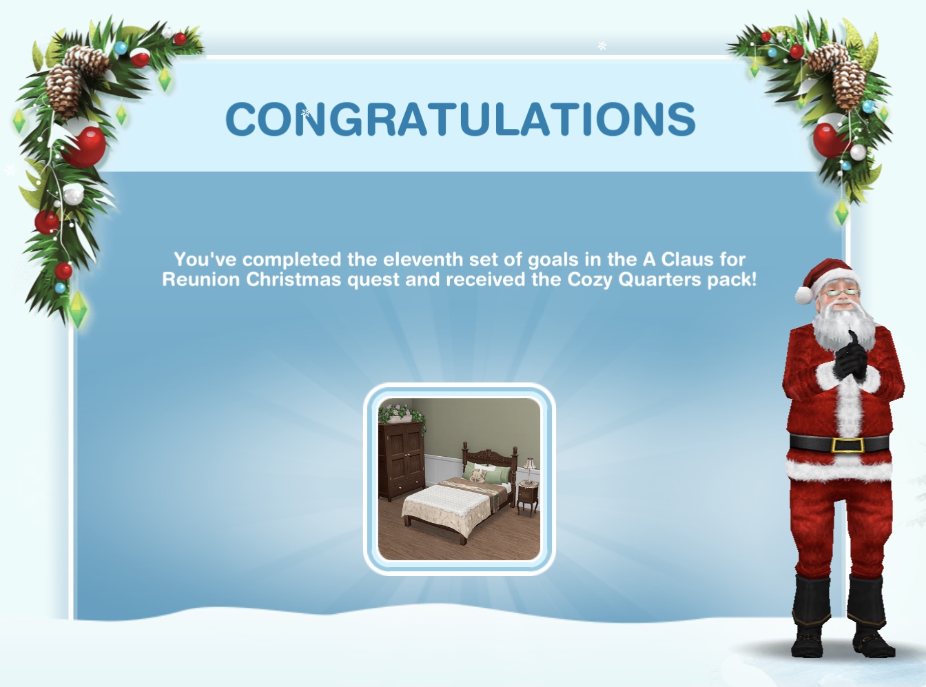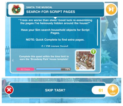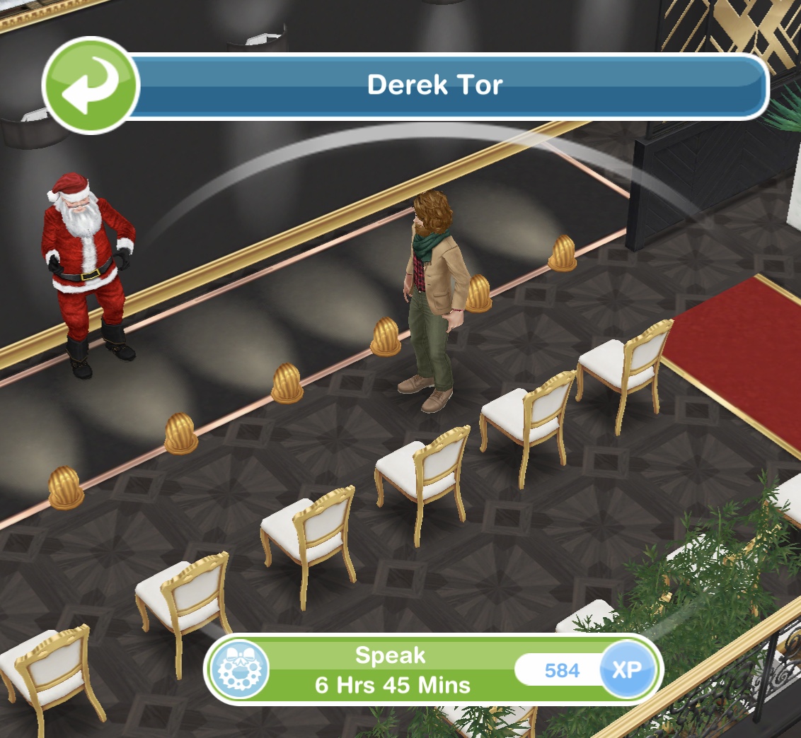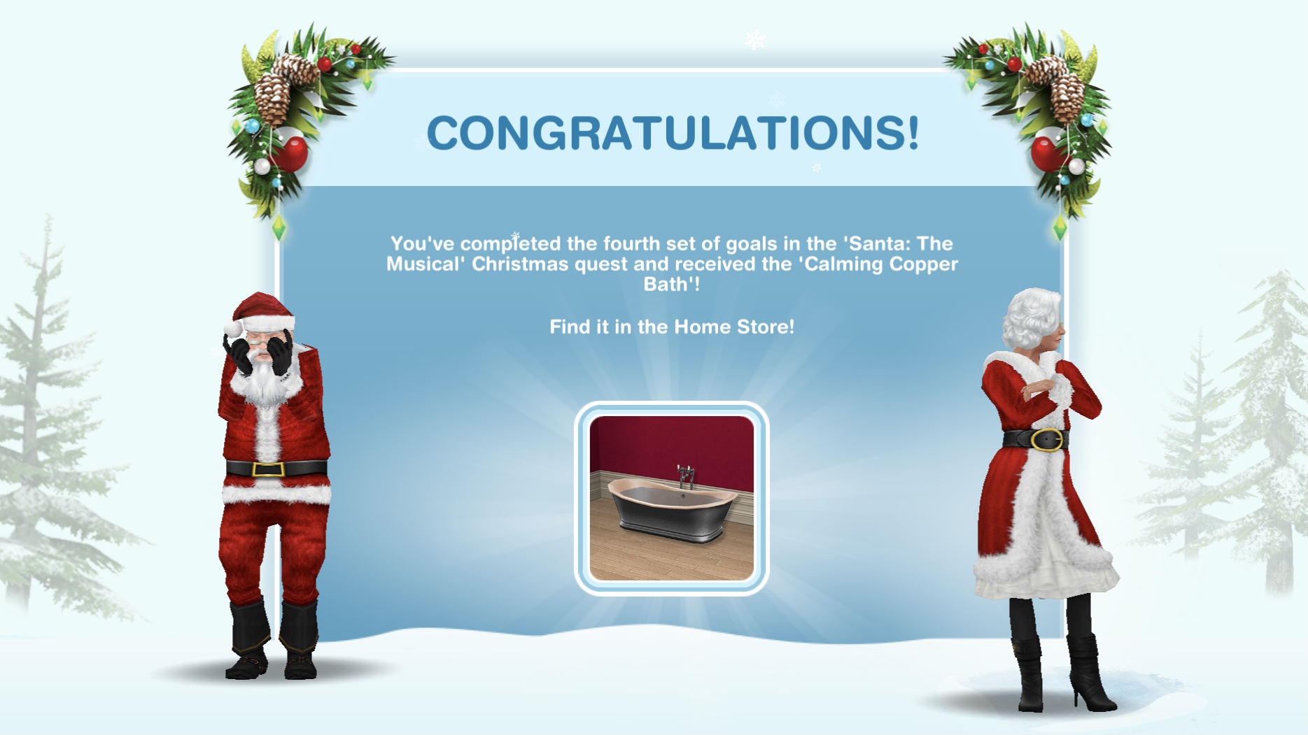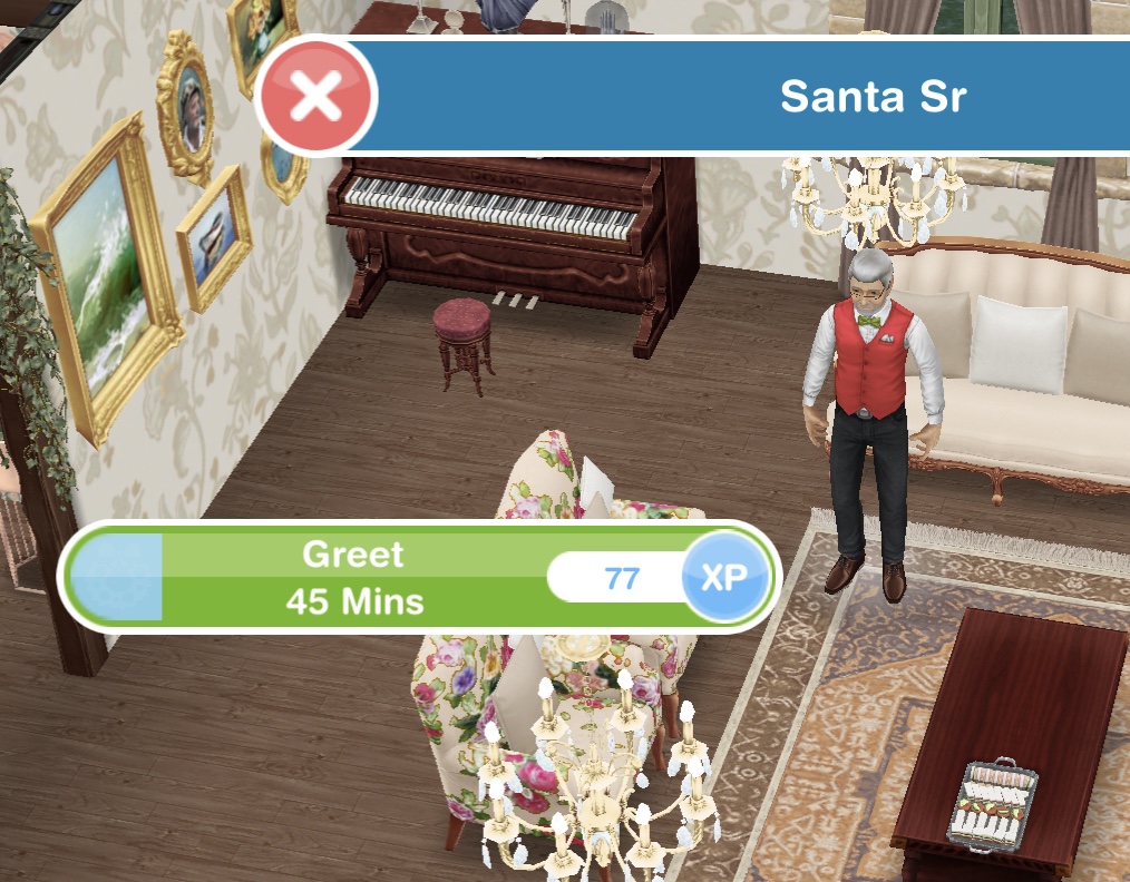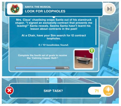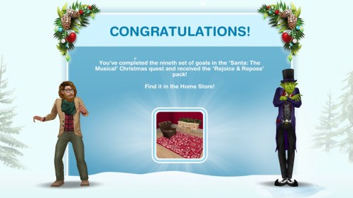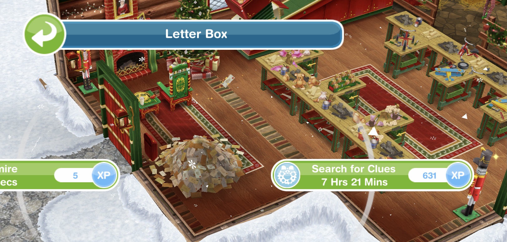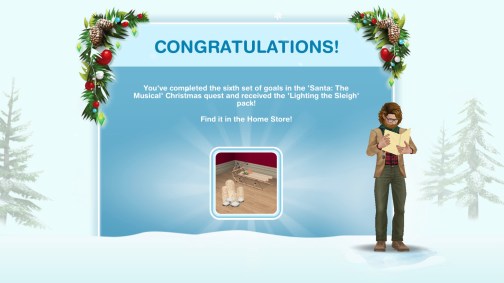 - Search for Santa’s contract 23 times- 1 hour 12 minutes [inspired: 1 hr 8 mins] (click on 23 items around Plümberg and your sims homes) (can skip all with 20 LP- need to earn LP quickly?)