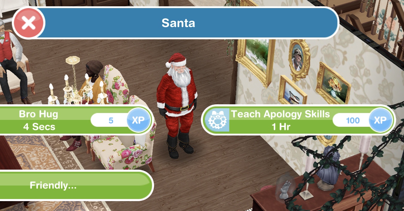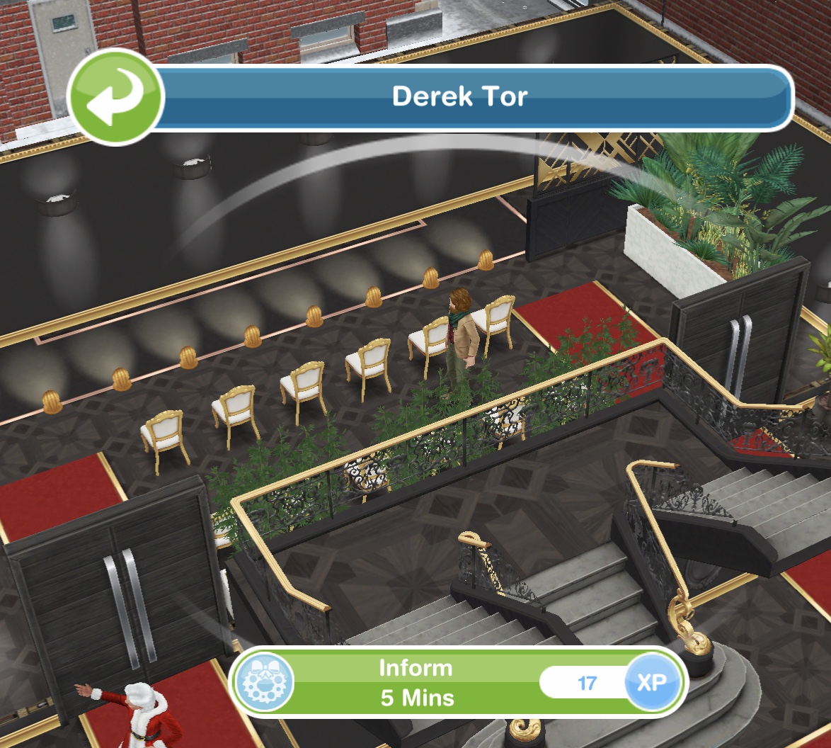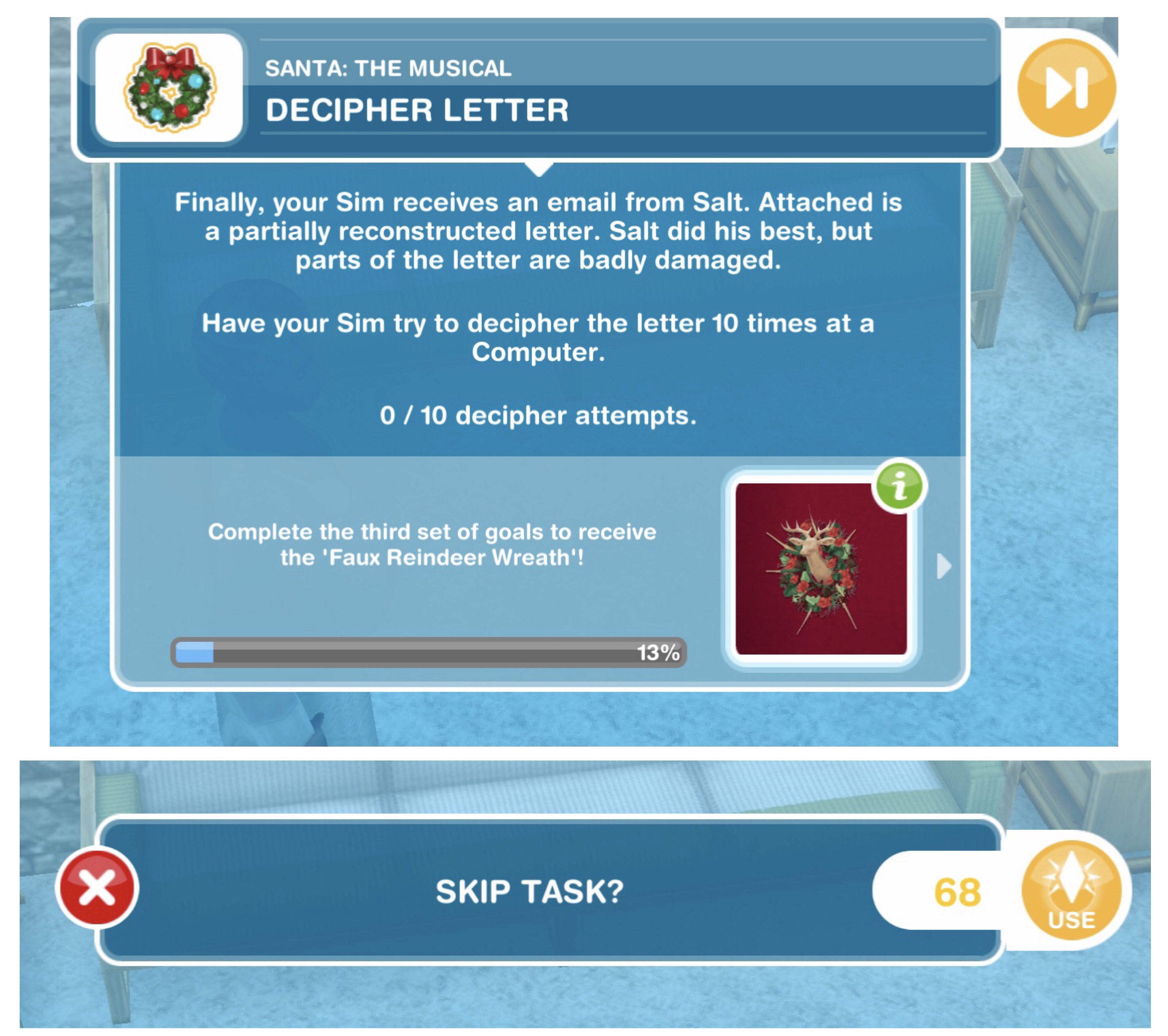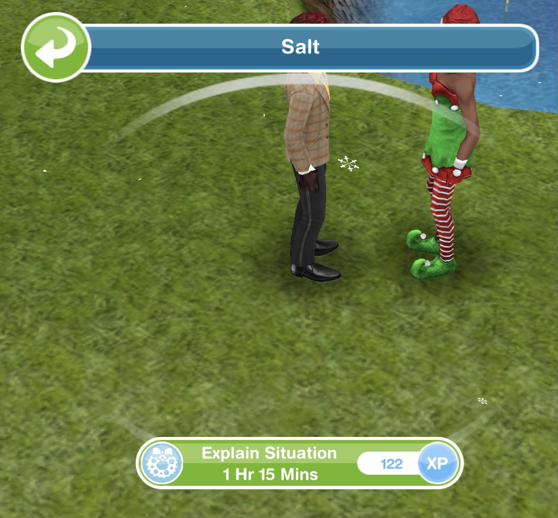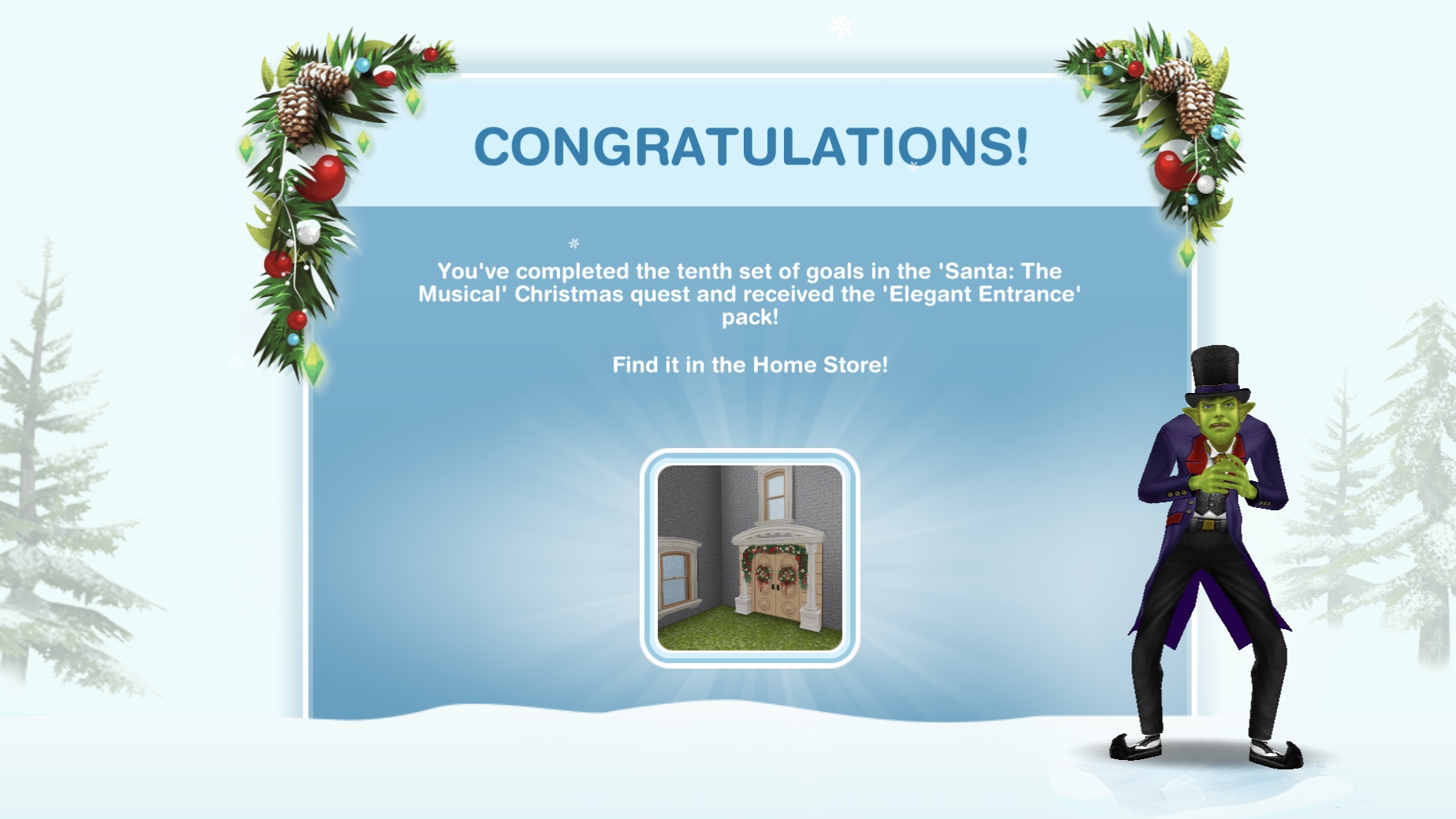 - Search for Santa’s contract 23 times- 1 hour 12 minutes [inspired: 1 hr 8 mins] (click on 23 items around Plümberg and your sims homes) (can skip all with 20 LP- need to earn LP quickly?)