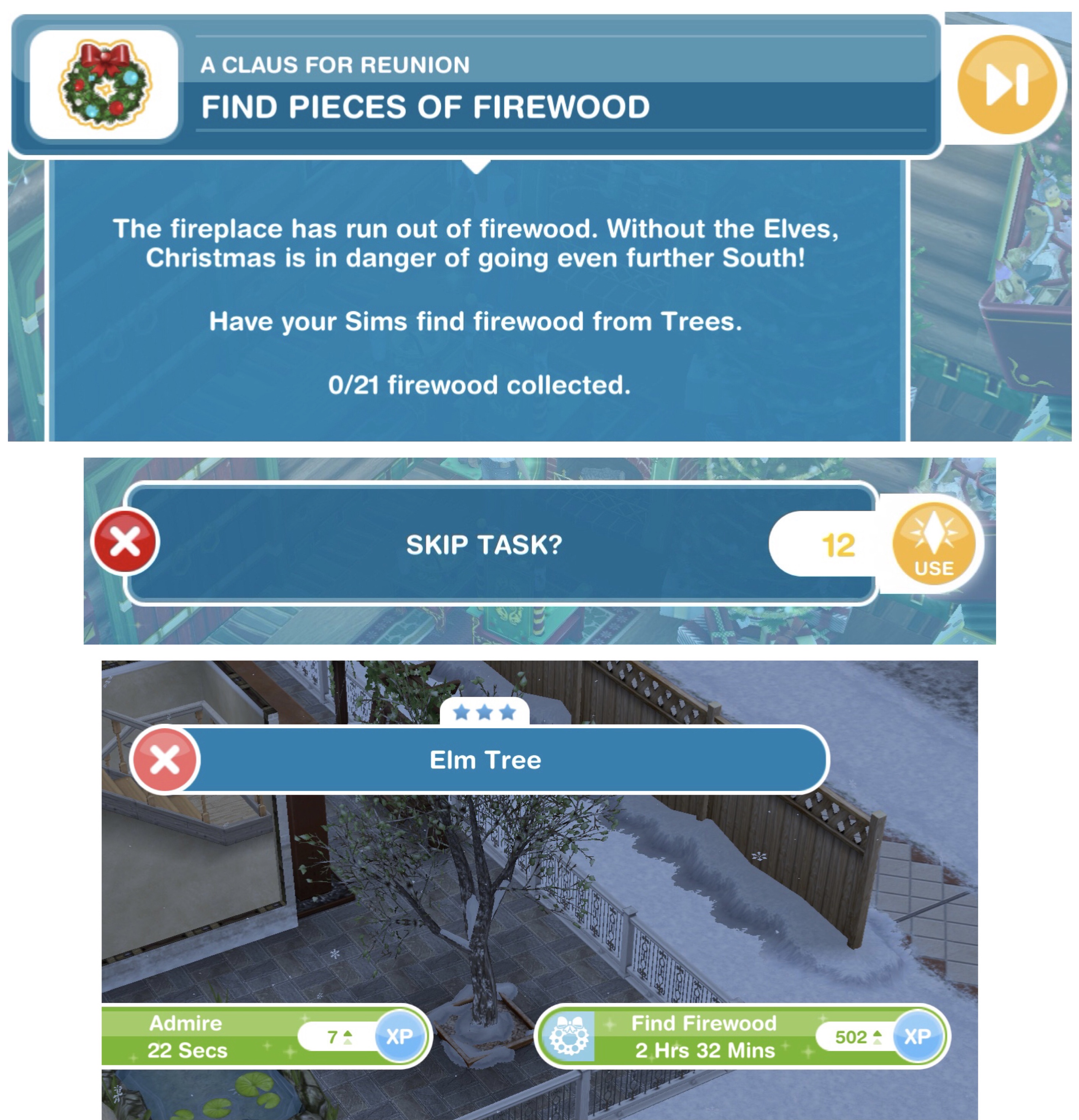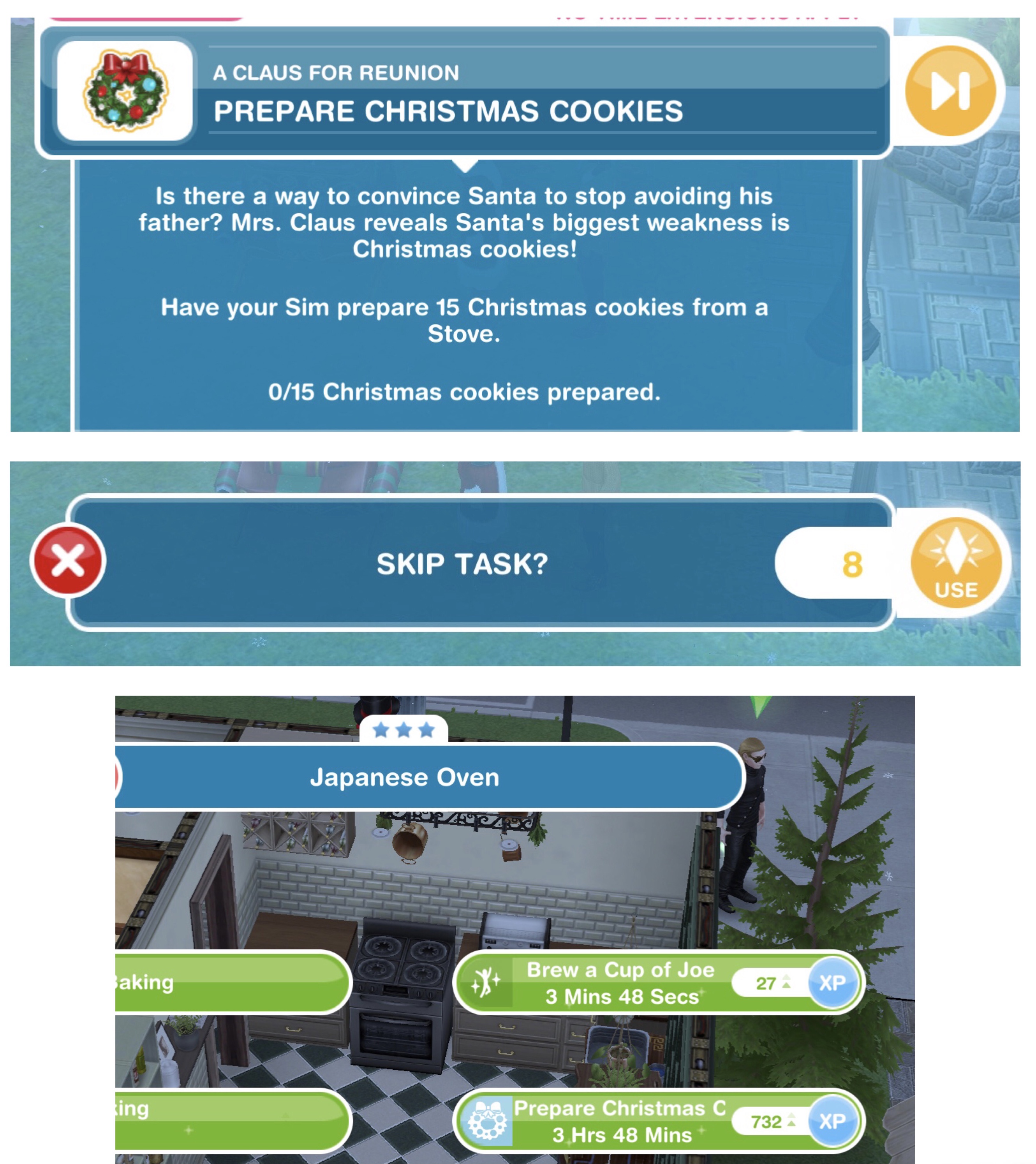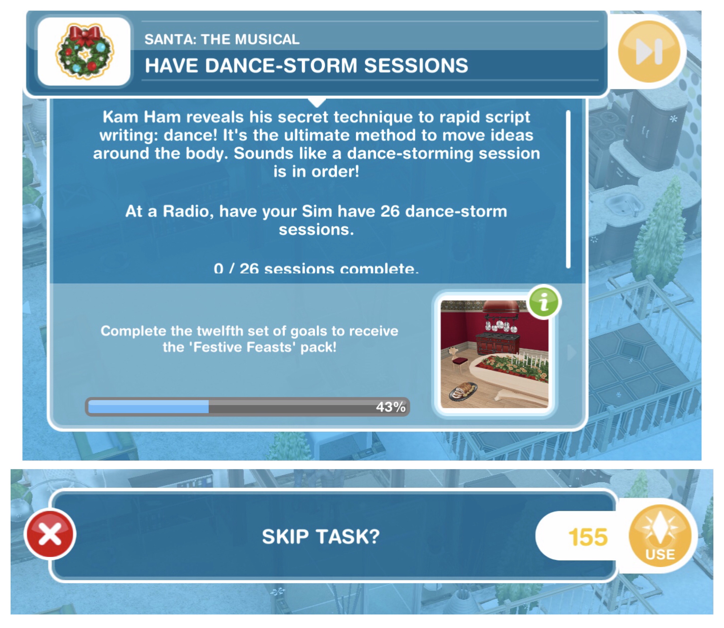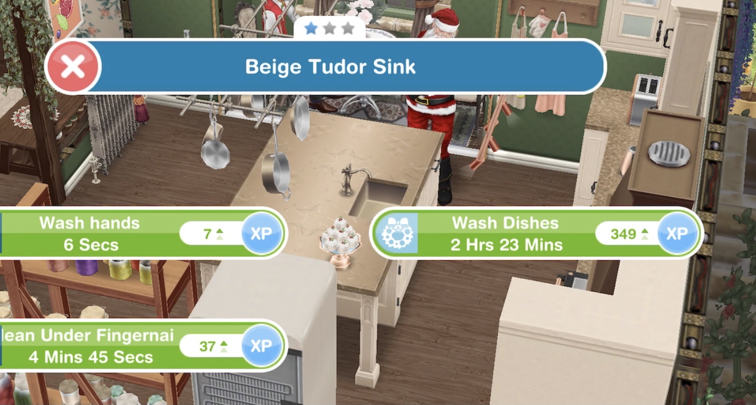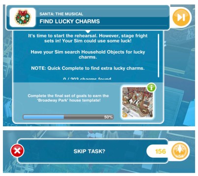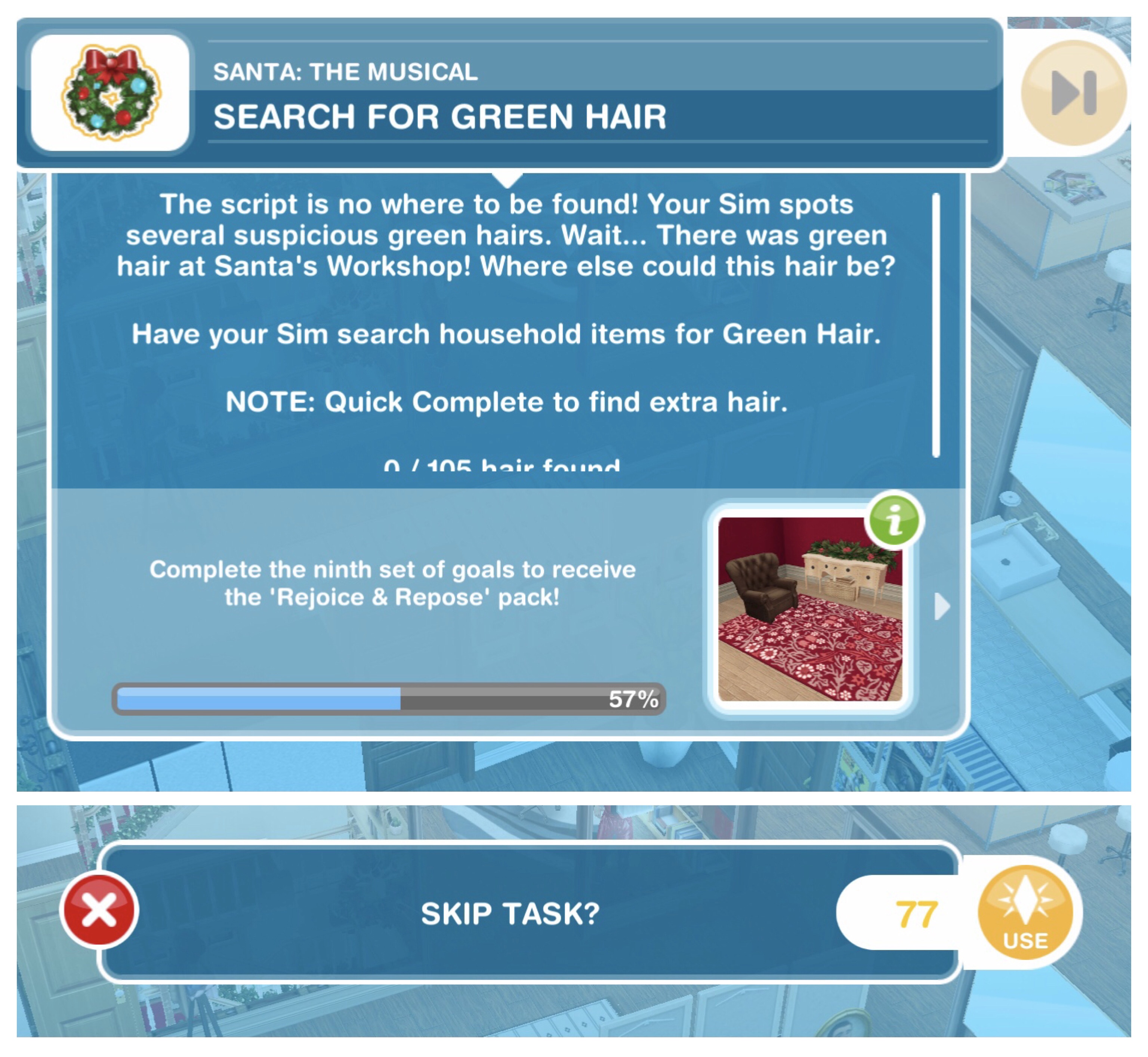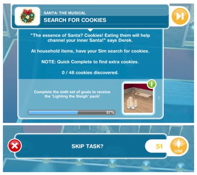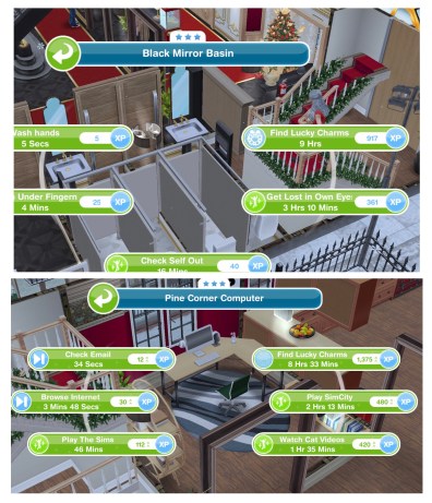 - Find 150 stocking fillers- 24 minutes [inspired: 23 mins] (select this option on objects around your sims houses) NOTE: there is no maximum on how many sims you can have completing these tasks that require multiple sims so have as many as possible completing them