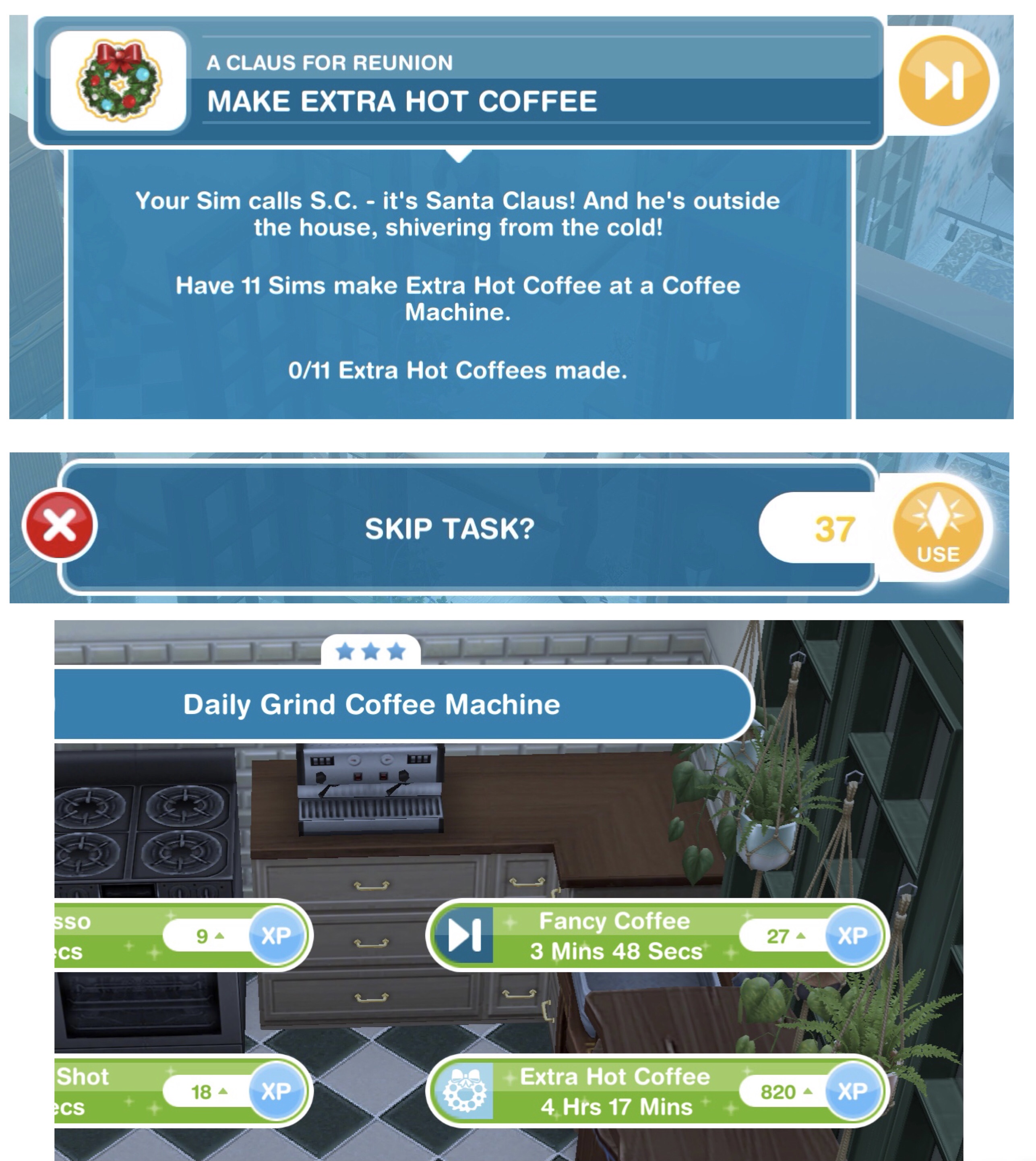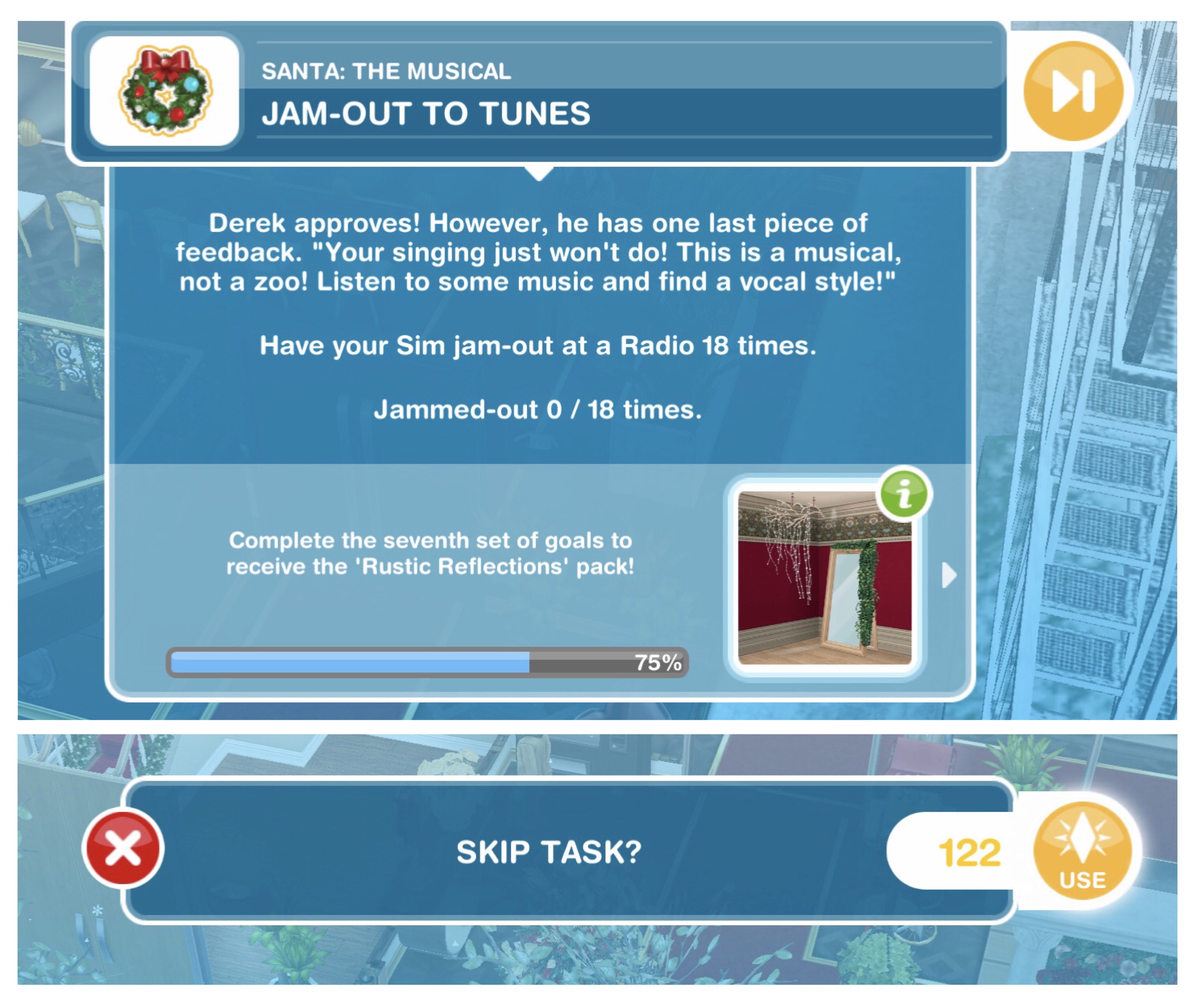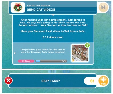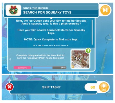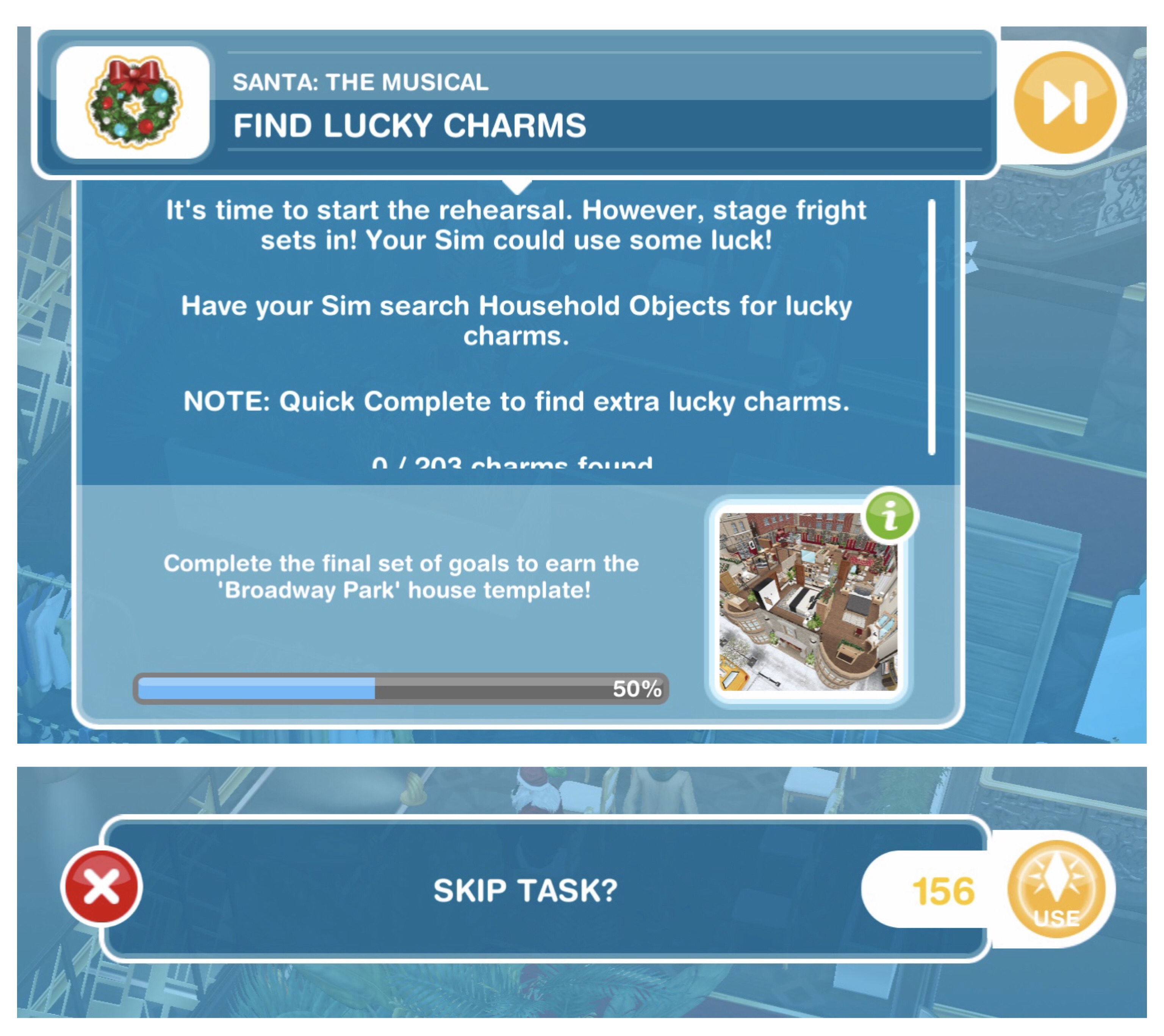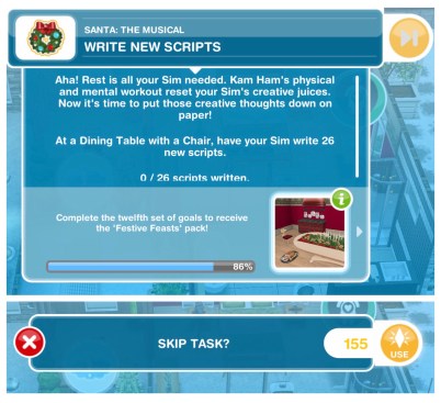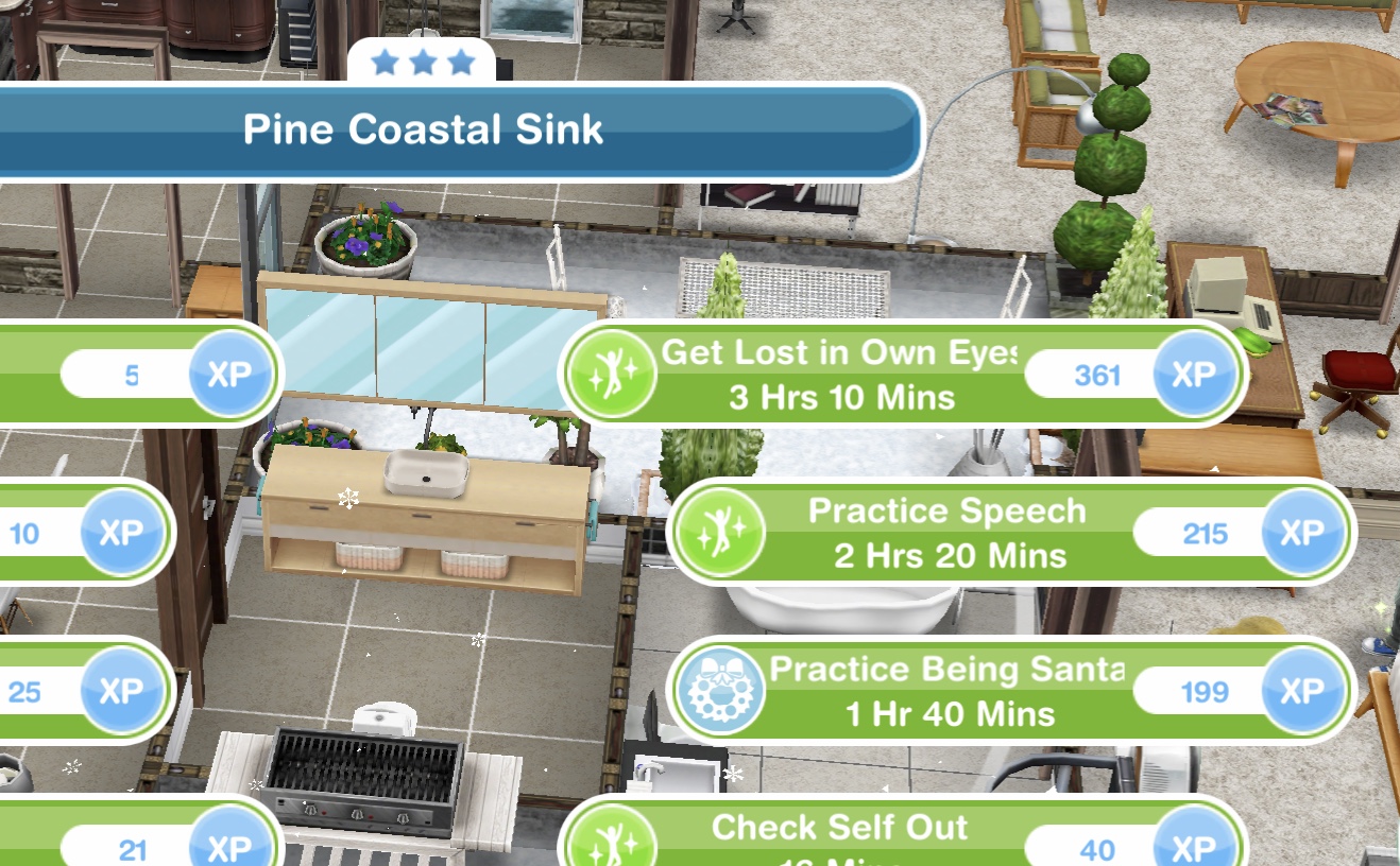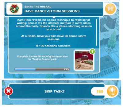 - Find 150 stocking fillers- 24 minutes [inspired: 23 mins] (select this option on objects around your sims houses) NOTE: there is no maximum on how many sims you can have completing these tasks that require multiple sims so have as many as possible completing them