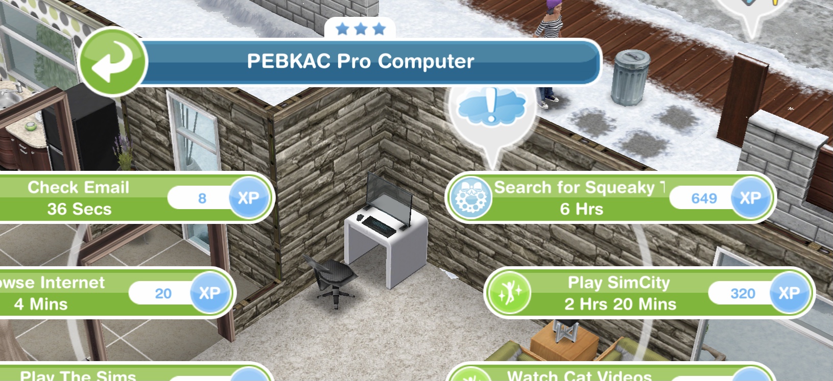 - Search for 20 pieces of information about Carole- 1 hour 12 minutes [inspired: 1 hour 8 mins] (one computer is needed for each sim completing this task) (can skip all with 17 LP- need to earn LP quickly?)