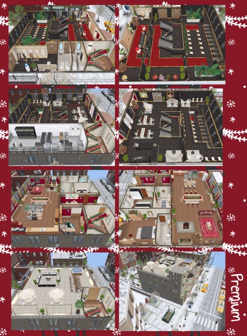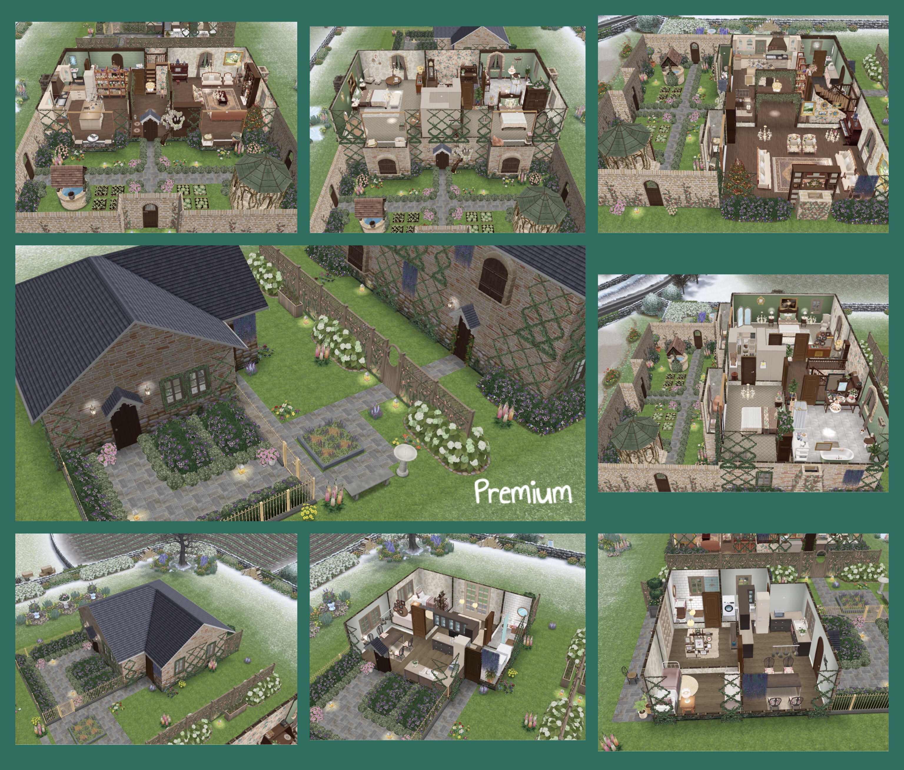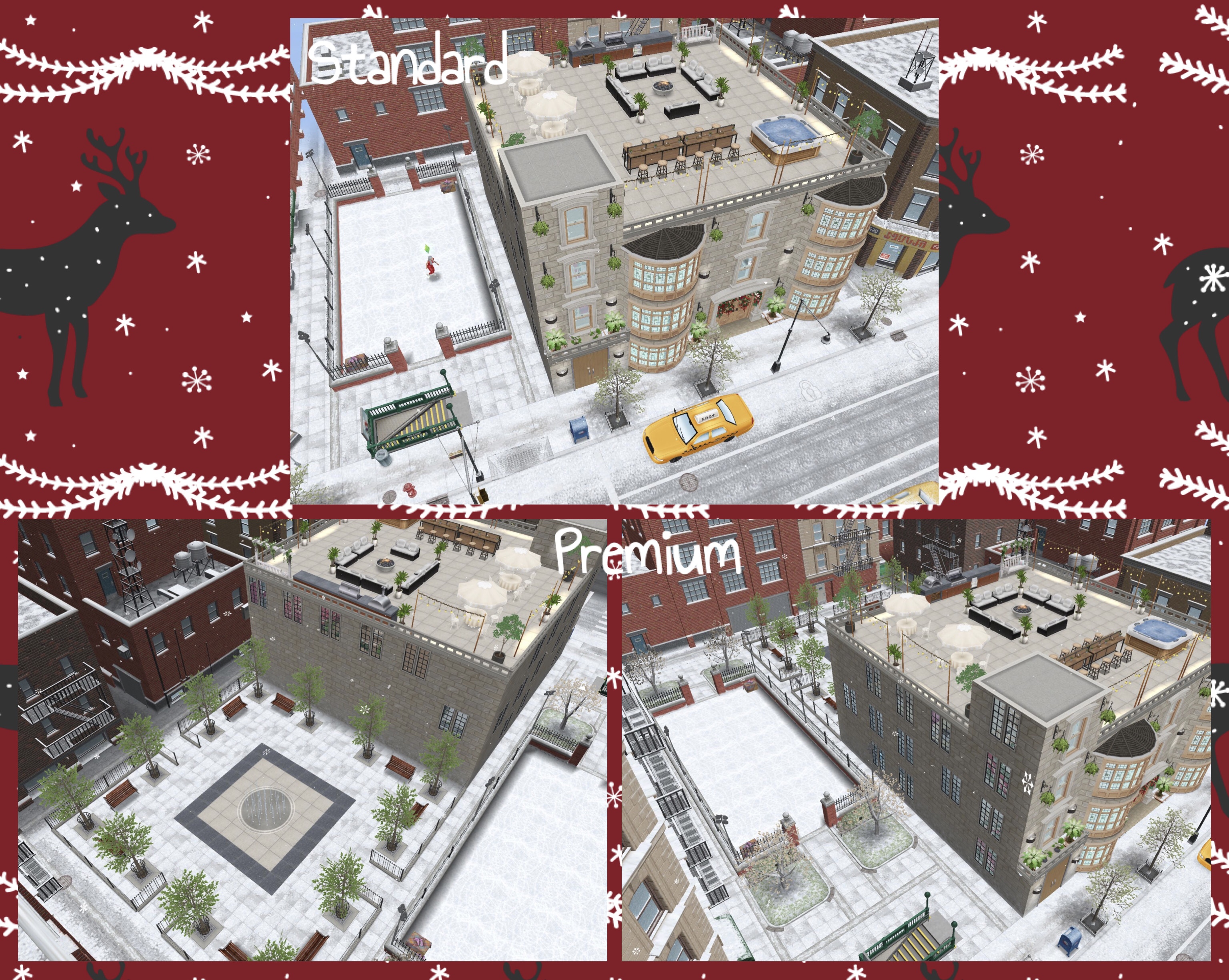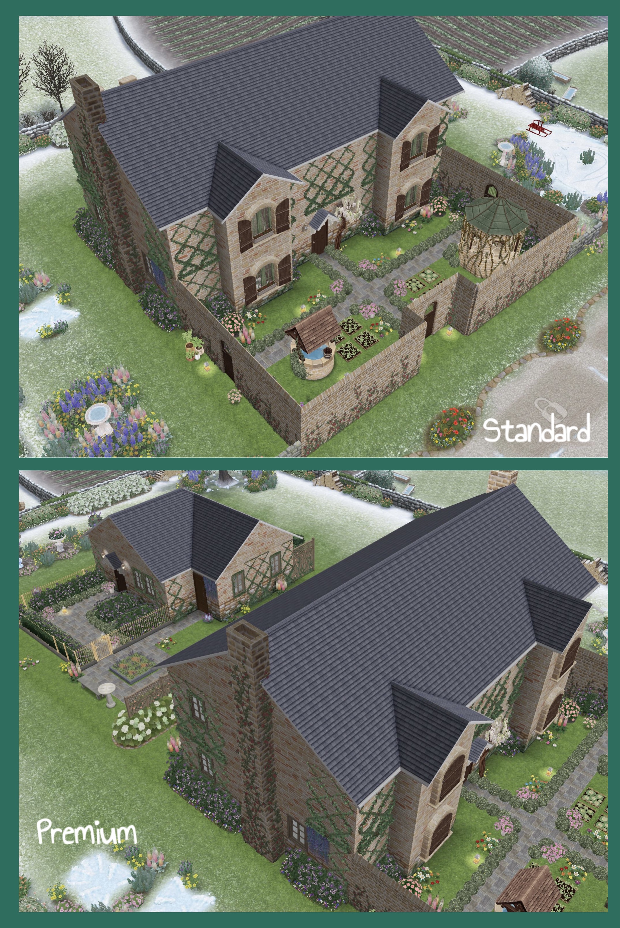 The premium house is the same you visit during the quest, it is 3 townhouses in one house and is located in a beautiful Scandinavian style town with wintry scenery. The main house is the same on the standard and premium residence, the premium has an extra 4 buildings behind the main house: