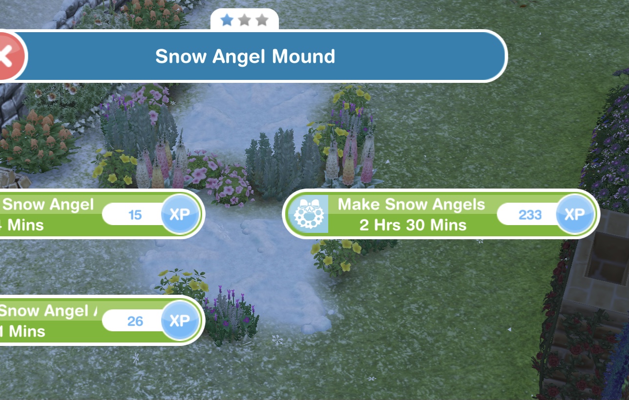 - Build a snowman- 5 minutes [inspired: 4 mins 45 secs] (x at front of sims house)