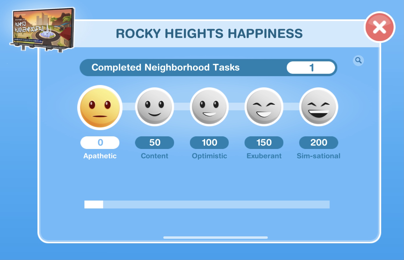 You will need to complete a certain amount of Neighbourhood tasks to level up the Rocky Heights Happiness: